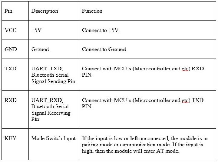 SPP (Serial Port Protocol) Bluetooth Module • • • Pins: These small size Bluetooth TTL transceiver modules are designed for serial communication. It allows your target device to both send or receive TTL data via Bluetooth technology without connecting a serial cable to your computer. The modules with the HC-03 and HC-05 firmware the Master and Slave integrated Bluetooth serial modules with firmware which allows you to modify master and slave mode at any time. HC 03 are industrial grade products, HC-05 are commercial grade products. The modules with the HC-04 and HC-06 firmware the modules which are factory set to be Master or Slave modules. Master and slave mode cannot be switched from the factory setting. HC 04 is an industrial grade product, HC-06 is a commercial grade product. The modules with the HC-09 firmware replacements for the HC-06 and HC-07 modules. HC-05 module is an easy to use Bluetooth SPP module, designed for transparent wireless serial connection setup. Serial port Bluetooth module is fully qualified Bluetooth V 2. 0+EDR (Enhanced Data Rate) 3 Mbps Modulation with complete 2. 4 GHz radio transceiver and baseband. - Master/Slave - Configuration using AT commands VCC (Power 3. 3 – 6 V) GND TXD RXD