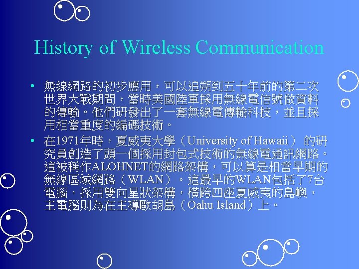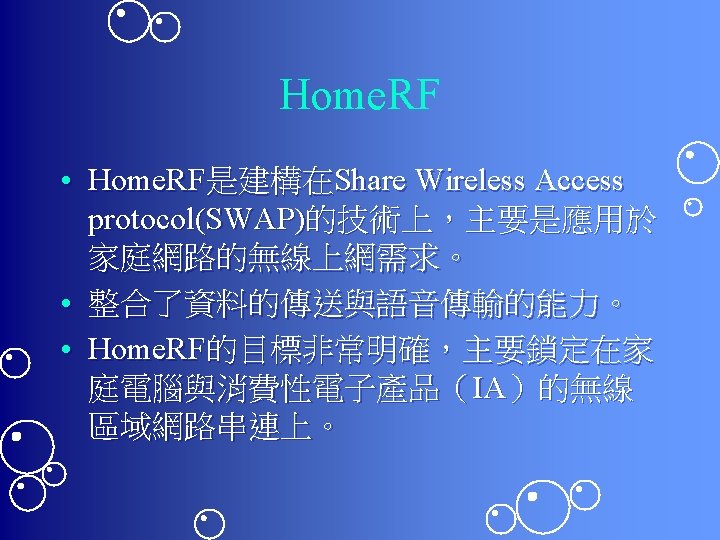 Wireless Tech Outline What is wireless Why wireless Slides: 19 Download presentation Wireless Tech 第八組 張維倫 Outline • • • What is wireless Why wireless Architecture of wireless LAN Comparison Summary What is wireless • Connection without wire Why wireless • No Wiring Hassle –沒有線 • High Mobility –可以走來走去 • 網路規劃較簡單 Architecture (1) -- Infrastructure WH AP • Infrastructure – – – • 就像手機的 – – – BSS AP (Access Point) WH (Wireless Host) BSS (Basic Service Set) 基地台 手機 服務範圍 Architecture (2) – Ad Hoc Network • • • No AP Host 直接連線 其中一台是虛擬 server Hidden terminal problem • CSMA/CA -- Carrier Sense Multiple Access with collision avoidance Wireless tech • Microwave • RF • Infrared ray Microwave • • Reflection antenna Point to Point Static Ex. NTUCC TA Net Infrared • Short range • Line of sight • Ex. 電視遙控器 RF tech • • Wi. Fi 802. 11 a/b/g 3 G Bluetooth Zig Bee UWB (ultra wide band) Home. RF Hyper. LAN RF tech (cont. ) • • Power Unlicensed band vs. licensed band Data rate Range Power Data Rate Range Comparison Bluetooth Ir. DA 市場定位 短距個人通 訊 利用頻率 802. 11 a/b/g Hyper. LAN Home. RF 短距、直線, 區域網路 個人通訊 區域網路 家庭網路 2. 4 GHz 波長 820 mm 2. 4 GHz/5 G Hz 5 GHz 2. 4 GHz 傳送速度 723 kbps 4/16 Mbps 54/11/54 Mb ps 54 Mbps 0. 8/1. 6 Mbps 傳送距離 10 M 3 -5 M 100 M 30 M/150 M( outdoor) 50 M 語音的傳遞 yes no no yes