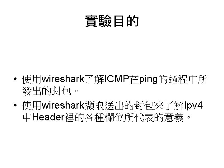 ICMP and Traceroute • • 啟動Wireshark軟體並開始抓取封包。 開始=>執行=>CMD 輸入”ping -n 10 www. ust. hk” 停止Wireshark,開始追蹤封包