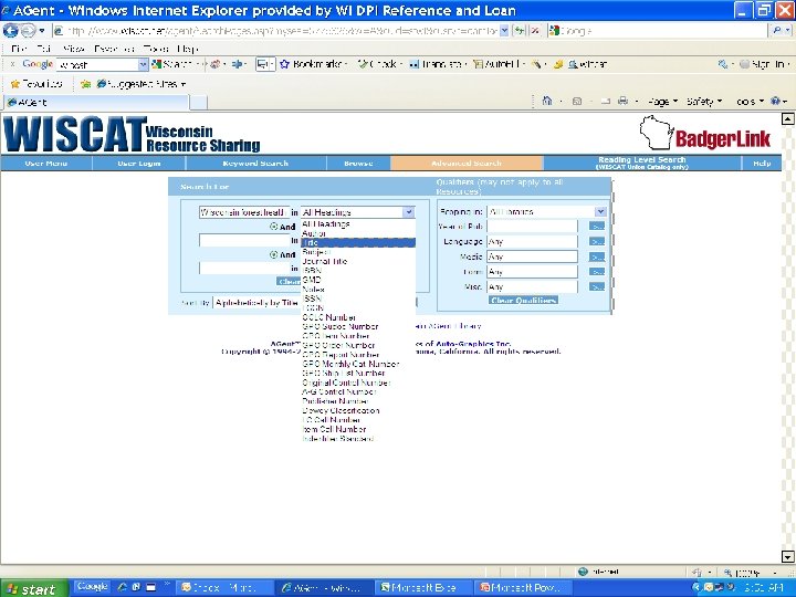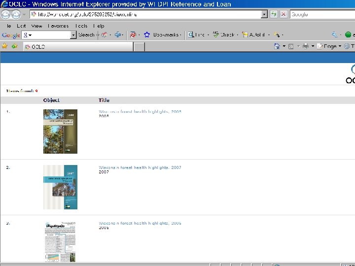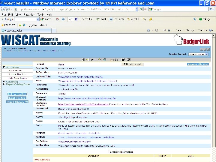 Primary Mode of Access in OPACs All records in World. Cat, WISCAT, Mad. Cat, LRBCat, First. Search Other libraries choose only records that best suit the needs of their users and collection development policies Advantage of controlled search environment State agency publications co-exist regardless of format providing full historical range of state agency publications