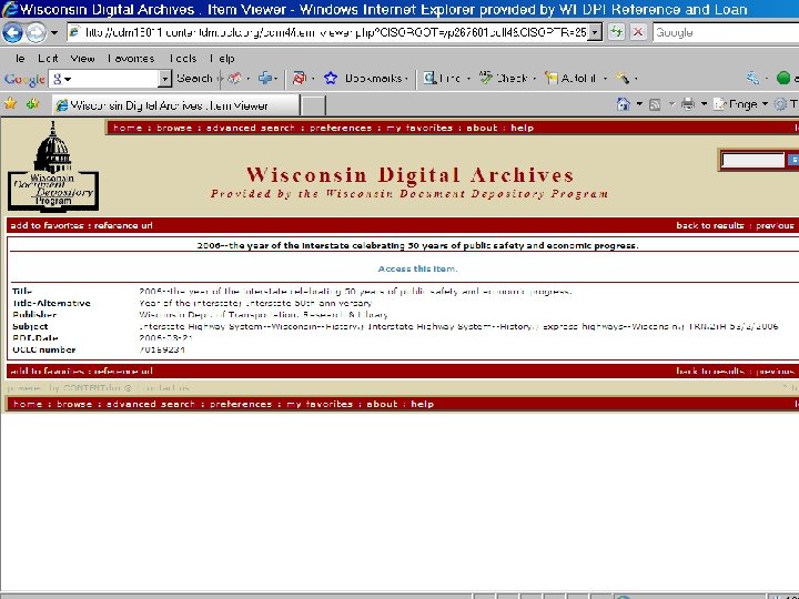 WIDAG Workflow from Creation to Access Discover and identify content to collect Catalog content in World. Cat (WIDAG) Use Web Harvesting Tools to create persistent URLs Create lists of fully cataloged digital archives URLs for distribution Libraries download catalog records from World. Cat or WISCAT into local OPACs for searching and access CTdm collection available for searching/browsing • Manual not automated • • Tools only available from a catalog record Create persistent URLs that are added to catalog records in 856 field Persistent URLs take user to CONTENTdm for access copy Preservation copy goes into Digital Archive (dark archive)