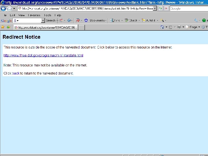 Two Supported Domain Structures Old digitalarchive. oclc. org ◦ http: //digitalarchive. oclc. org/request? id%3 Doclcnum%3 A 213353403 *No need to update records already in local OPACs New worldcat. org/oclc ◦ http: //worldcat. org/oclc/213353403/viewonline