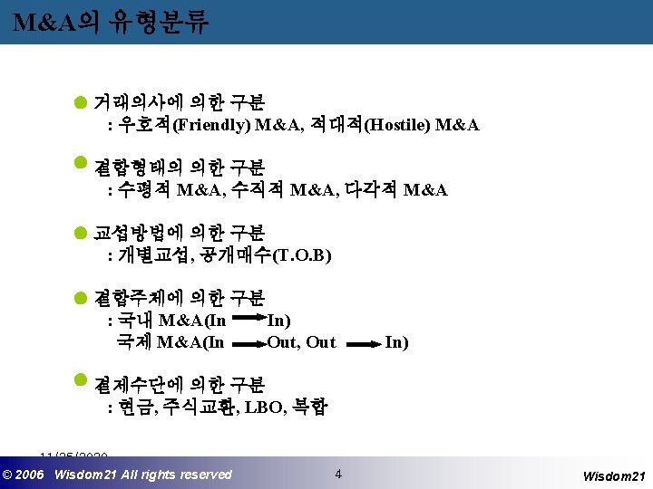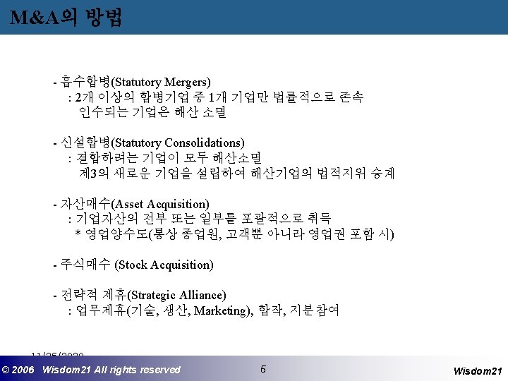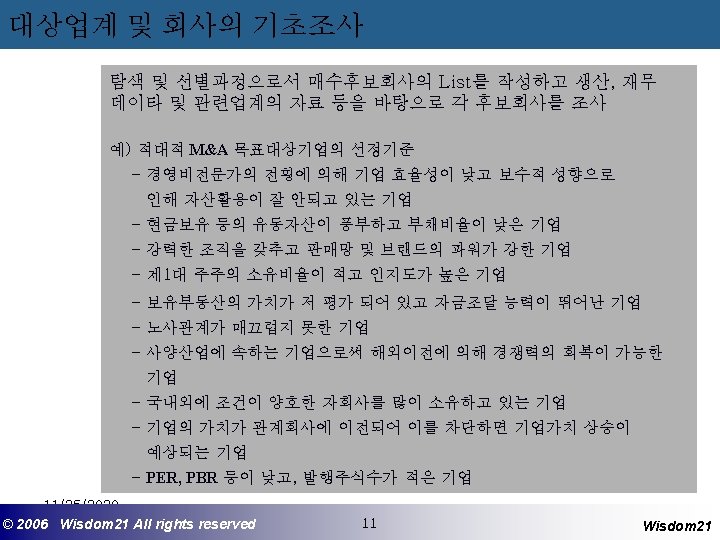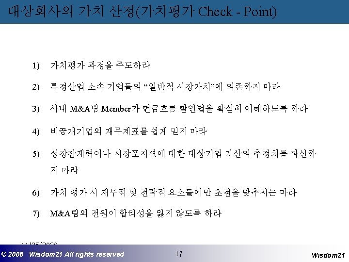 M&A 자문기관의 역할 - Finding 기능 : 매수(또는 매각) 기업의 발굴 - Agent 기능 : 의뢰인을 대리하여 교섭, 거래성사 - Structuring 기능 (Financial Advisor) : 기업전략의 구축 및 검토, 대상기업분석, 가치산정, 결제방법선택, M&A후 Restructuring - Deal Manager기능 : 업무의 총괄 수행 - 매수자금조달기능 (Financial Provider) : Syndicated Loan, LBO Loan 기타 Financing 11/25/2020 ©© 2006 2005 Wisdom 21 Wisepost Business All rights. Partners reserved All rights reserved 6 6 Wisdom 21