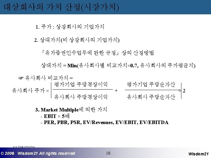 대상회사의 가치 산정(수익가치) ※ 현금흐름할인가치(Discounted Cash Flow Value) 기업가치 = 영업의 가치(Value of Operations) + 잔존가치(Terminal Value) n FCF(t) TV 현금흐름가치 = ∑ + t=1 (1+r)^t (1+r) ^ n FCF(t) : t 년도의 잉여 현금흐름 t : 현금흐름 추정년도 r : 한인율 n : 최종 추정 년도(통상 5년 또는 10년) TV(Terminal Value) : n년도 말의 기업가치 또는 n년도 말의 기업의 처분가치 - 결정요소 : FCF(Free Cash Flow), 할인율(WACC) 및 잔존가치 (Terminal Value) 11/25/2020 ©© 2006 2005 Wisdom 21 Wisepost Business All rights. Partners reserved All rights reserved 15 15 Wisdom 21