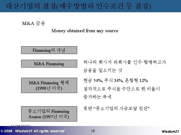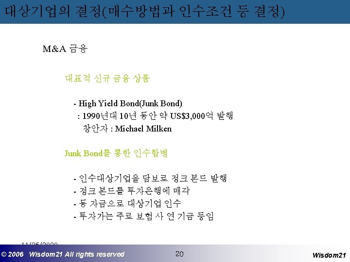 대상기업의 결정(매수방법과 인수조건 등 결정) M&A 금융 중소기업의 자금조달 원천 자금조달원천 비율 Commercial bank, nonmortgage-based 38% Commercial finance/credit card company 34% Asset-based lenders 24% Vendor credit 20% Private business loans 16% Personal or home equity loans 16% Private buyout investment firm/Private placement of stock 4% SBICs or other Small Business Administrationguaranteed financing 4% Venture capital firm 2% Investment banks/brokerage firms 1% Internal financing 30% * 1997년 Arthur Anderson이 미국의 중소기업을 대상으로 조사한 결과이고 비율의 합이 100%이상인 이유는 일부 조사대상 기업들이 1개 이상의 자금조달원천을 사용하였기 때문 11/25/2020 ©© 2006 2005 Wisdom 21 Wisepost Business All rights. Partners reserved All rights reserved 19 19 Wisdom 21