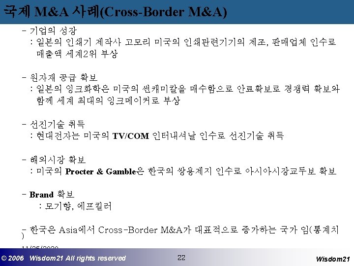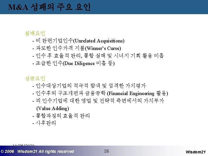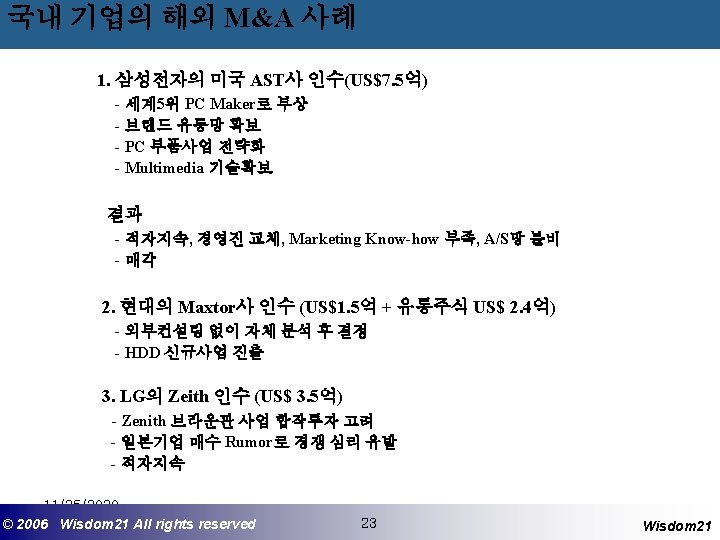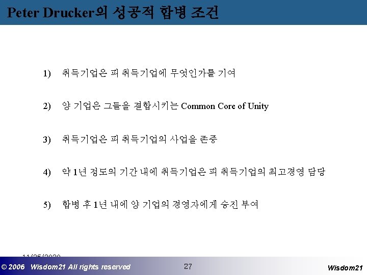 사후관리 - 인수 후의 Restructuring 과 Financial Engineering 1) 자산의 재배치 (Asset Redeployment) 예 : 세금감소를 위한 매각, 영업손실 중지를 위한 매각 2) 감춰진 자산가치의 포착 (Capture of Hidden Asset Values) - 인수 후의 영업 및 전략사의 가치부가 1) 관리기술의 이전 (Skills Transfer) - 일반관리기술의 이전 - 기능별 기술 이전 2) 기능별 규모의 경제 실현 - 개발 (Development) - 제조 (Manufacturing) - 판매 (Sales) - 물류 (Physical Distribution) - After Sales Service 3) 산업구조의 변경 11/25/2020 ©© 2006 2005 Wisdom 21 Wisepost Business All rights. Partners reserved All rights reserved 26 26 Wisdom 21