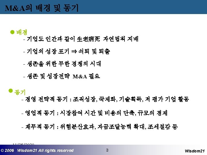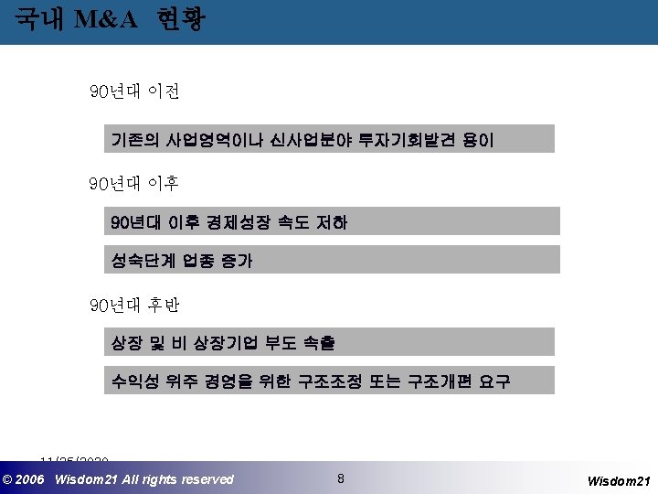 M&A 업무 내용 업무분야 업무내용 재무 인수자금조달, 대상기업의 가치평가 회계 재무제표의 분석, 정밀실사 세무 세금관련 조사 법무 계약서 작성, 법률적 문제 검토 산업분석 Negotiation 대상기업이 속한 산업분석 및 전망 Project Manager로서 종말 협상 * Valuation, Evaluation, Negotiation, Financing 11/25/2020 ©© 2006 2005 Wisdom 21 Wisepost Business All rights. Partners reserved All rights reserved 7 7 Wisdom 21