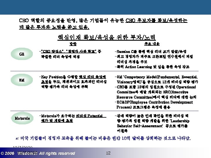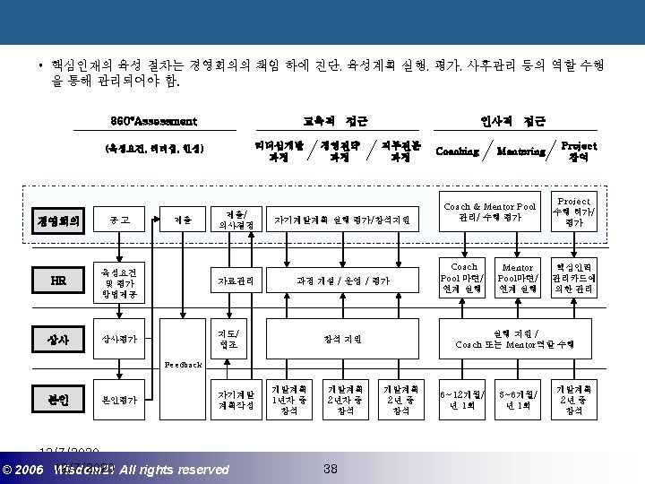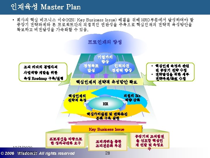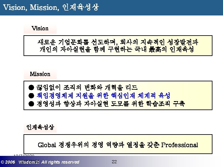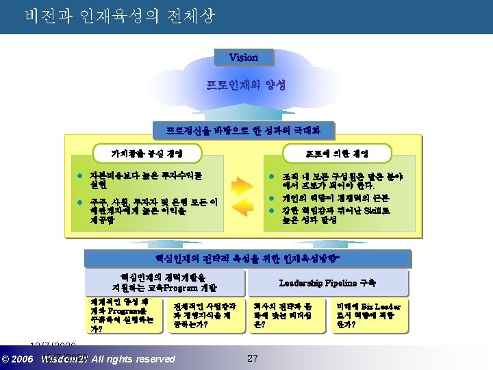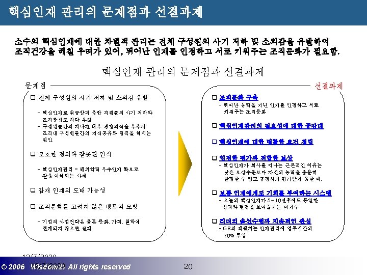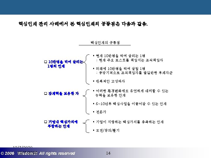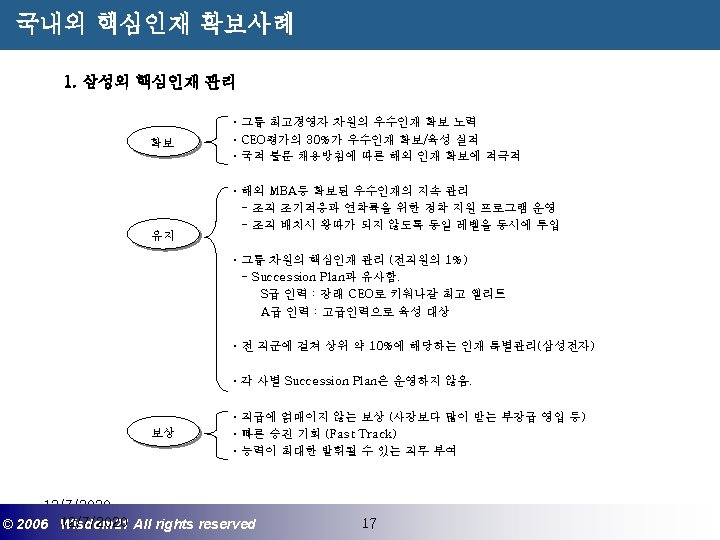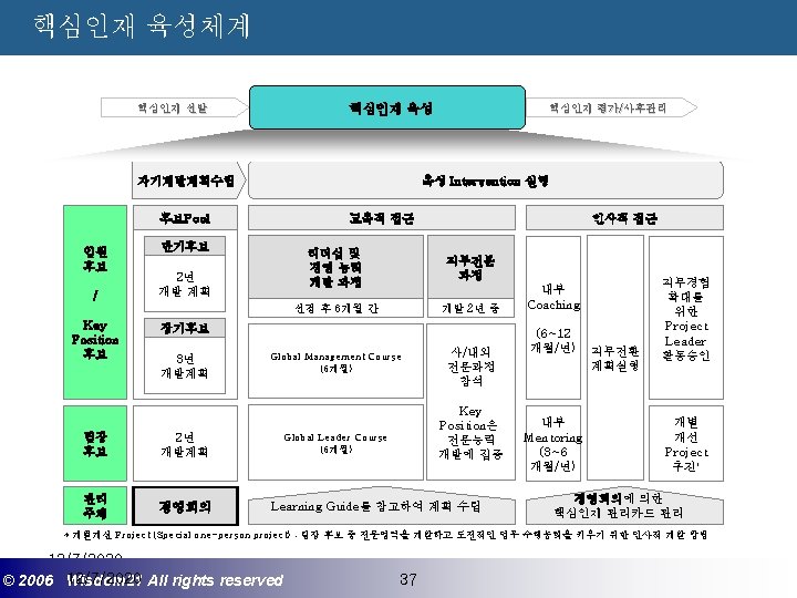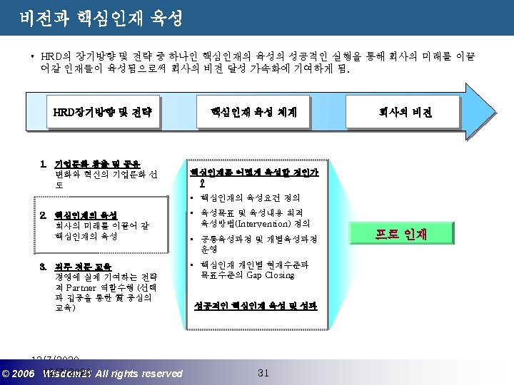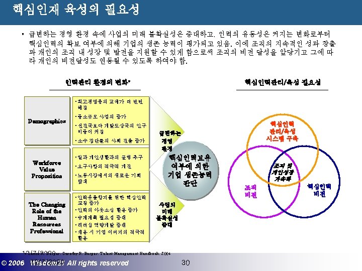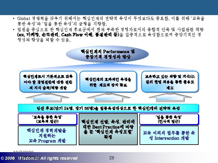 Wisdom 21 Management Consulting www wisdom 21 co Slides: 41 Download presentation 핵심인재 육성전략과 사례 Wisdom 21 Management Consulting www. wisdom 21. co. kr 1 환경변화와 HRD Critical Issue 2 핵심인재 육성의 필요성 3 핵심인재 육성 운영사례 12/7/2020 ©© 2006 2005 Wisdom 21 Wisepost Business All rights. Partners reserved All rights reserved 2 2 21세기 변화의 keyword 21 C 핵심 Trends 12/7/2020 ©© 2006 2005 Wisdom 21 Wisepost Business All rights. Partners reserved All rights reserved 3 3 Drastic Change - Radio: 38 year 변 화 의 가 속 화 - Television: 13 year - Cable: 10 year - Internet: 5 year - Hotmail: 1 year - Napster: < 1 year 시대 10년이면 1년이면 한 달이면 하루면 강 강산이 변하 던 시대 산이 변하는 시대 *미국에서 인구 5천만명이 이용할 때까지 소요된 시간. *Napster : 음악 파일 교환 web-site 12/7/2020 ©© 2006 2005 Wisdom 21 Wisepost Business All rights. Partners reserved All rights reserved 4 4 1 환경변화와 HRD Critical Issue 2 핵심인재 육성의 필요성 3 핵심인재 육성 운영사례 12/7/2020 ©© 2006 2005 Wisdom 21 Wisepost Business All rights. Partners reserved All rights reserved 7 7 1 환경변화와 HRD Critical Issue 2 핵심인재 육성의 필요성 3 핵심인재육성 운영사례 12/7/2020 ©© 2006 2005 Wisdom 21 Wisepost Business All rights. Partners reserved All rights reserved 21 21 4) Key Position 육성 요건 구조 • 비전제시/실행 • 변화관리 • 합리적 의사결정 • Business Acumen • 효율적 자원관리 Leading Change Leading Business Leading People 끊임없는 자기 개발 (직무분야의 최고 전문 능력 추구 ) 12/7/2020 ©© 2006 2005 Wisdom 21 Wisepost Business All rights. Partners reserved All rights reserved 35 35 • • • 목표 설정 및 공유 개방적 의사소통 Empowerment 솔선수범 도전적 자세 주인의식 핵심인재 육성 Roadmap 개발 1년 개발 2년 Step 1. (공통교육) Step 2. (개별 교육) GMC (Global Management Course) 임원 후보 Business Acumen Learning Guide를 통한 독서, 사내, 외 특화 과정 참석 360 진단 자기 계발 계획 서 작성 Coaching(사내) 360 진단 자기 개발 계획 평가 Project Assignment (Cross Functional Issue 중심) Leading People I Key Position 후보 Learning Guide를 통한 독서, 사내, 외 특화 과정 참석 360 진단 자기 계발 계획 서 작성 Function 전문화를 위한 사외 전문 Curriculum 수강 (HR 대학, Techno MBA, Law Firm 전문과정 등) Coaching(사내) GLC (Global Leader Course) 팀장 후보 Leading People II Biz. Admin. 360 진단 자기 계발 계획 서 작성 360 진단 자기 개발 계획 평가 Learning Guide를 통한 독서, 사내, 외 특화 과정 참석 Mentoring(사내) 360 진단 자기 개발 계획 평가 개별 개선 Project 진행 12/7/2020 ©© 2006 2005 Wisdom 21 Wisepost Business All rights. Partners reserved All rights reserved 39 39 21세기 기업경영의 마르지 않는 샘 물 위즈덤 21의 정보 자료입니다. Wisdom 21 Management Consulting Business Introduction