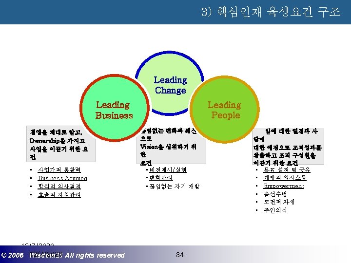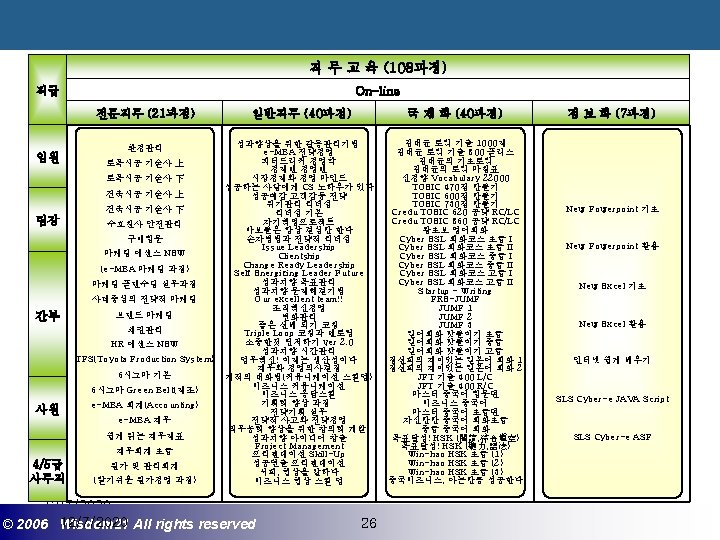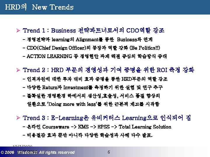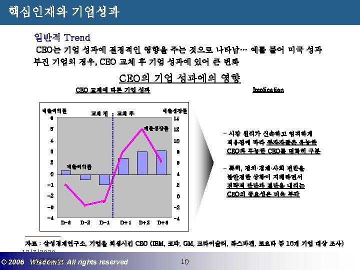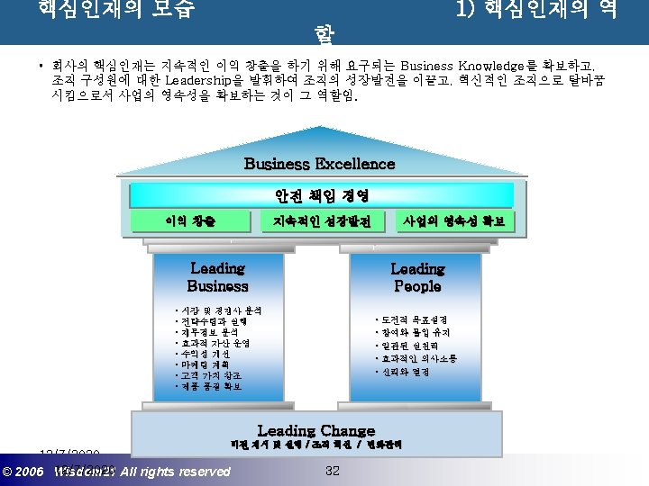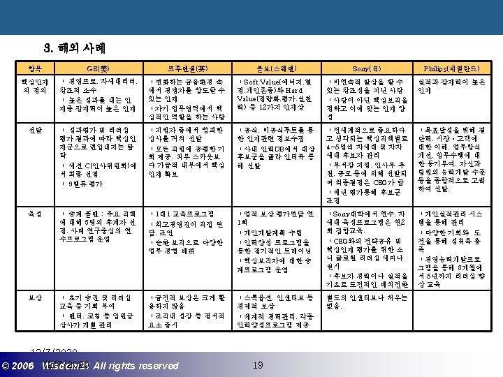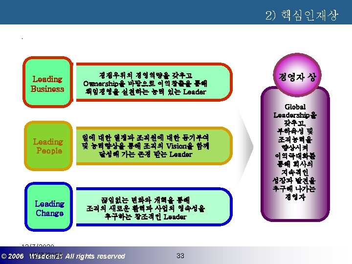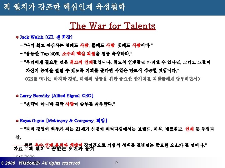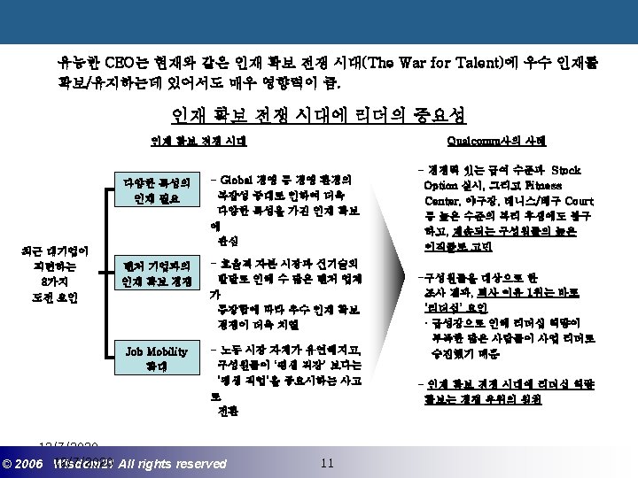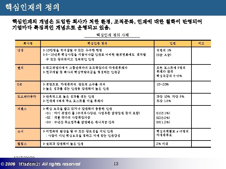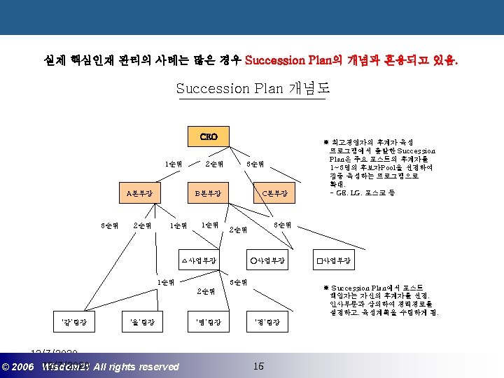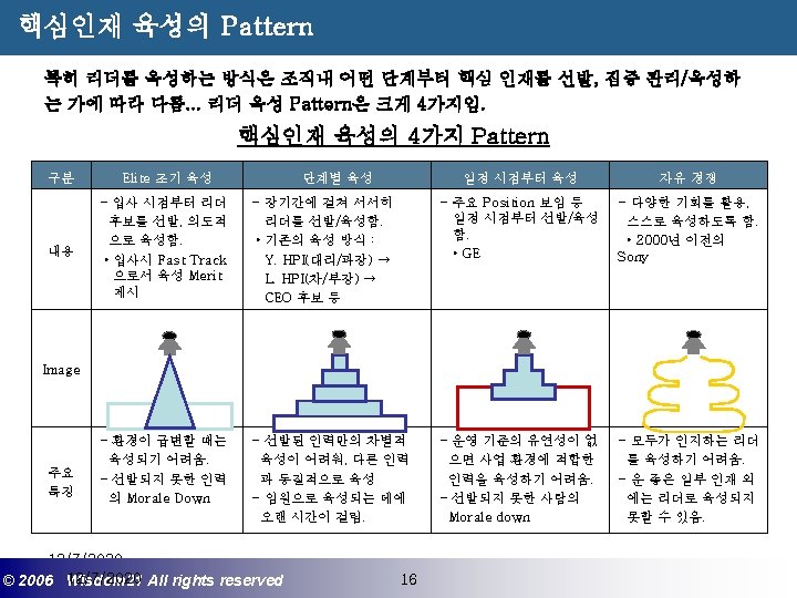 Wisdom 21 Management Consulting www wisdom 21 co Slides: 41 Download presentation 핵심인재 육성전략과 사례 Wisdom 21 Management Consulting www. wisdom 21. co. kr 1 환경변화와 HRD Critical Issue 2 핵심인재 육성의 필요성 3 핵심인재 육성 운영사례 12/7/2020 ©© 2006 2005 Wisdom 21 Wisepost Business All rights. Partners reserved All rights reserved 2 2 21세기 변화의 keyword 21 C 핵심 Trends 12/7/2020 ©© 2006 2005 Wisdom 21 Wisepost Business All rights. Partners reserved All rights reserved 3 3 Drastic Change - Radio: 38 year 변 화 의 가 속 화 - Television: 13 year - Cable: 10 year - Internet: 5 year - Hotmail: 1 year - Napster: < 1 year 시대 10년이면 1년이면 한 달이면 하루면 강 강산이 변하 던 시대 산이 변하는 시대 *미국에서 인구 5천만명이 이용할 때까지 소요된 시간. *Napster : 음악 파일 교환 web-site 12/7/2020 ©© 2006 2005 Wisdom 21 Wisepost Business All rights. Partners reserved All rights reserved 4 4 1 환경변화와 HRD Critical Issue 2 핵심인재 육성의 필요성 3 핵심인재 육성 운영사례 12/7/2020 ©© 2006 2005 Wisdom 21 Wisepost Business All rights. Partners reserved All rights reserved 7 7 1 환경변화와 HRD Critical Issue 2 핵심인재 육성의 필요성 3 핵심인재육성 운영사례 12/7/2020 ©© 2006 2005 Wisdom 21 Wisepost Business All rights. Partners reserved All rights reserved 21 21 4) Key Position 육성 요건 구조 • 비전제시/실행 • 변화관리 • 합리적 의사결정 • Business Acumen • 효율적 자원관리 Leading Change Leading Business Leading People 끊임없는 자기 개발 (직무분야의 최고 전문 능력 추구 ) 12/7/2020 ©© 2006 2005 Wisdom 21 Wisepost Business All rights. Partners reserved All rights reserved 35 35 • • • 목표 설정 및 공유 개방적 의사소통 Empowerment 솔선수범 도전적 자세 주인의식 핵심인재 육성 Roadmap 개발 1년 개발 2년 Step 1. (공통교육) Step 2. (개별 교육) GMC (Global Management Course) 임원 후보 Business Acumen Learning Guide를 통한 독서, 사내, 외 특화 과정 참석 360 진단 자기 계발 계획 서 작성 Coaching(사내) 360 진단 자기 개발 계획 평가 Project Assignment (Cross Functional Issue 중심) Leading People I Key Position 후보 Learning Guide를 통한 독서, 사내, 외 특화 과정 참석 360 진단 자기 계발 계획 서 작성 Function 전문화를 위한 사외 전문 Curriculum 수강 (HR 대학, Techno MBA, Law Firm 전문과정 등) Coaching(사내) GLC (Global Leader Course) 팀장 후보 Leading People II Biz. Admin. 360 진단 자기 계발 계획 서 작성 360 진단 자기 개발 계획 평가 Learning Guide를 통한 독서, 사내, 외 특화 과정 참석 Mentoring(사내) 360 진단 자기 개발 계획 평가 개별 개선 Project 진행 12/7/2020 ©© 2006 2005 Wisdom 21 Wisepost Business All rights. Partners reserved All rights reserved 39 39 21세기 기업경영의 마르지 않는 샘 물 위즈덤 21의 정보 자료입니다. Wisdom 21 Management Consulting Business Introduction