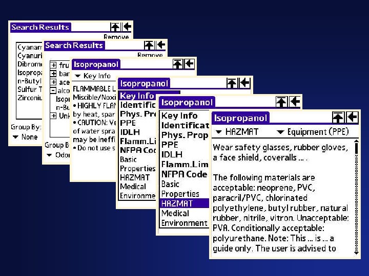 Scenario – Known Substance • • • User: Officer-in-Charge from first engine on scene Non-pressurized tanker overturned and leaking Know from DOT # that substance is hydrogen peroxide Driver splashed with substance, sitting away from vehicle, may have ingested Small fire from tanker engine