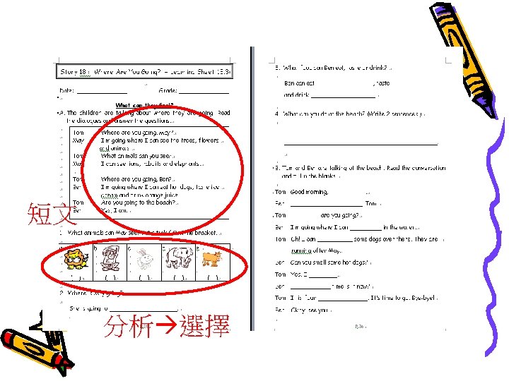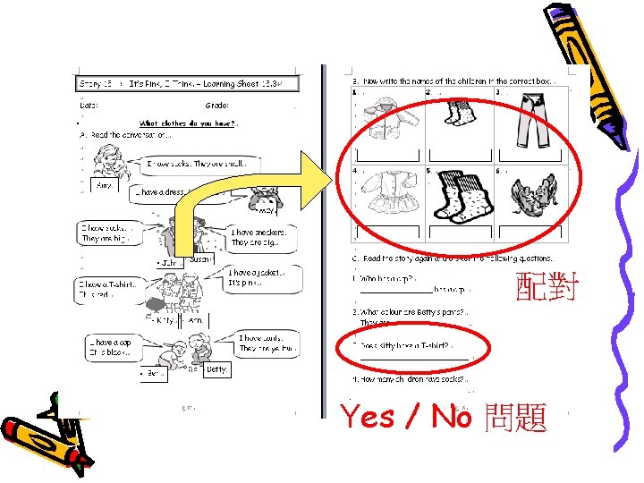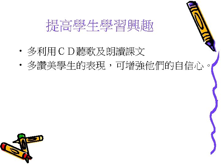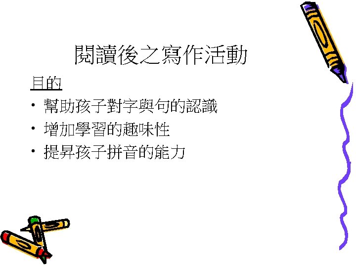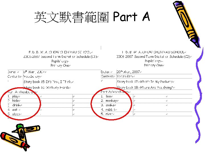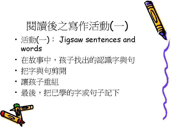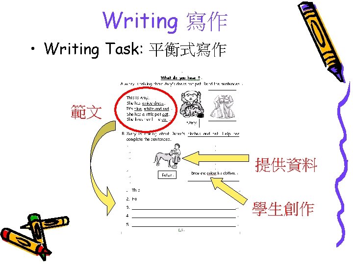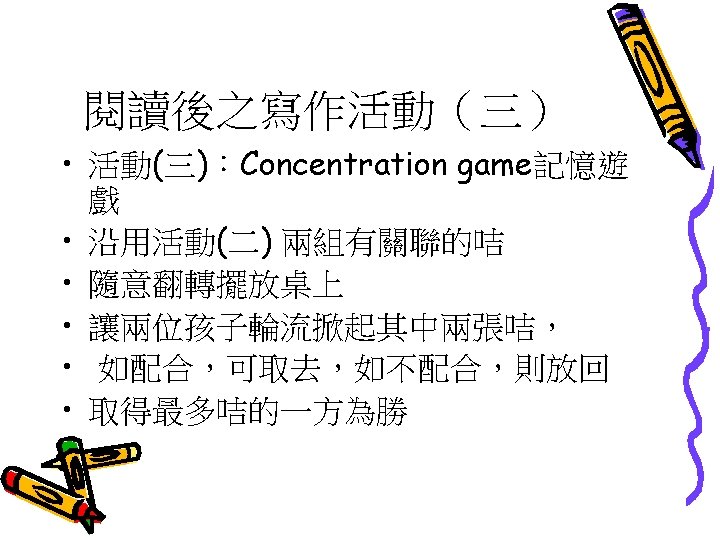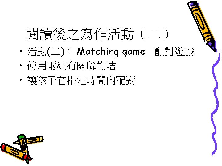 With my hands I can clap fingers fing Slides: 29 Download presentation 閱讀後之寫作活動(一) 例子: With my hands I can clap. fingers fing ers 或 f i n g e r s 活動(二) Matching game 配對遊戲 例子(一):動詞 + 名詞 eat mouth see eyes 例子(二):Rhyming words 押韻字 tie fly toe go 活動(二) Matching game 配對遊戲 例子(三):動詞 + 動名詞/進行式 eating ride riding running 活動(二) Matching game 配對遊戲 例子(四):名詞 + 形容詞 1. A bear fuzzy soft 2. Jelly gooey soft 3. TV square hard Wordbank (寶庫) 題目 Colours 內容 red blue green yellow orange pink 目的 增強學生學習生字的能力 溫習內容 • 下學期測驗範圍 課文: 12 What’s the weather like today? 13 Cat’s Party 14 Smarty pants 15 It’s pink, I think. 16 With my hands 17 What’s in my pocket? Vocabulary items 生字 Study Guide e. g. 文法 (Grammar)教學重點 Study Guide & Grammar 13 Cat’s party 15 It’s pink. I think. 16 With my hands 17 What’s in my pocket? Reading 閱讀 Learning Sheet & Assessment Short Writing 開放式問題 • e. g.