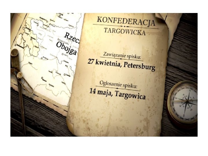 1972 Konfederacja targowicka Na czele konfederacji stanęli: Stanisław Szczęsny Potocki, Franciszek Ksawery Branicki i Seweryn Rzewuski. Konfederaci zwrócili się o pomoc do carycy Katarzyny II, która wysłała do Rzeczypospolitej swe wojska. Interwencja rosyjska przekształciła się w wojnę polskorosyjską. Wojska Rzeczpospolitej zostały pokonane. Zwycięstwo konfederacji przypieczętowało przystąpienie do niej króla. Władzę w kraju przejęli konfederaci.