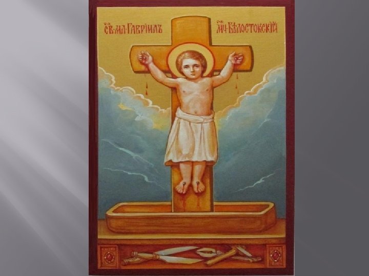 ŚWIĘTY GABRIEL ZABŁUDOWSKI męczennik, dzieciątko (Muczenik mładieniec Gawriił Zabłudowskij) Wspominamy pamięć: 20 kwietnia / 3 maja (rocznica śmierci), 22 września -(rocznica przeniesienia relikwii w 1992 r. ) trzecia niedziela po Pięćdziesiątnicy (Sobór świętych białoruskich). .
