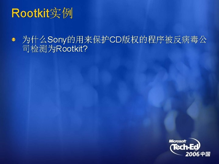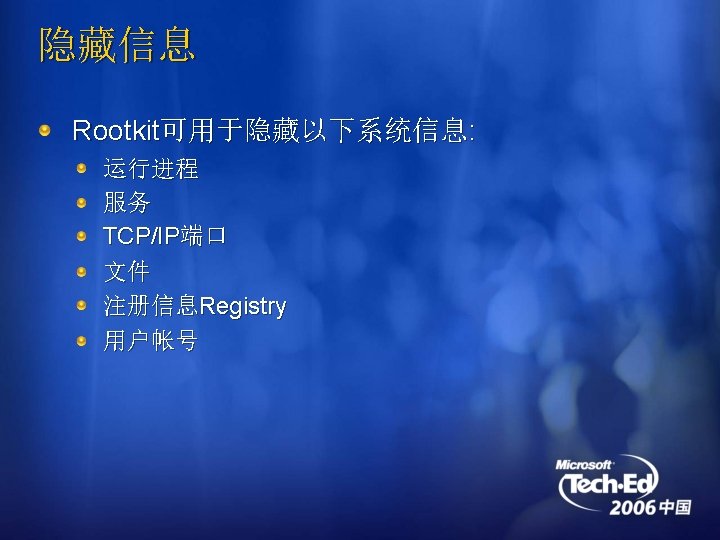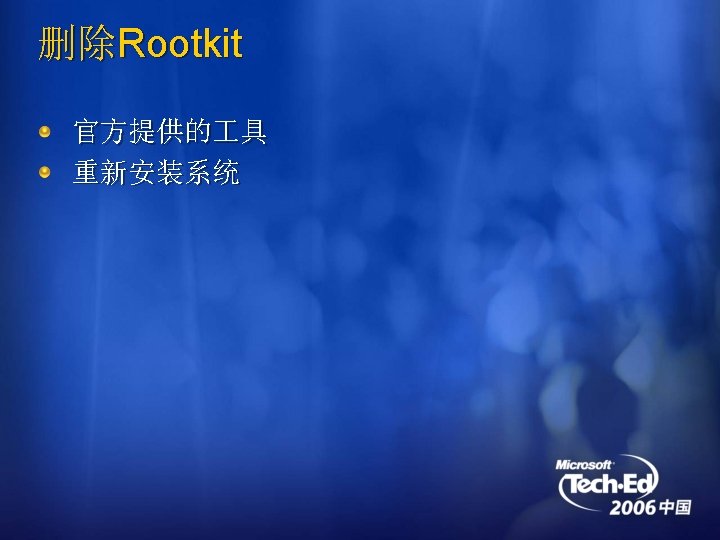 检测Rootkit Offline OS检测 API副作用检测 Rootkit检测 具 Strider/Ghostbuster,MS Research Rootkit. Revealer,Sysinternals