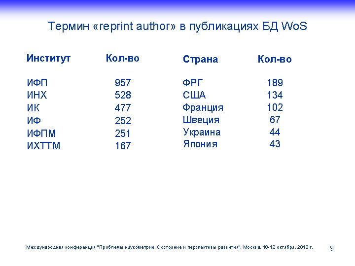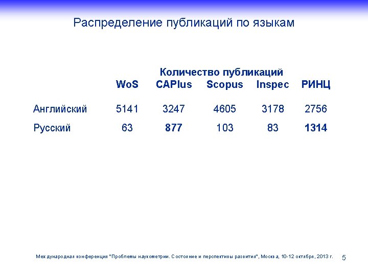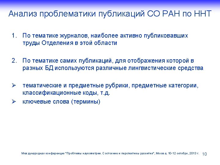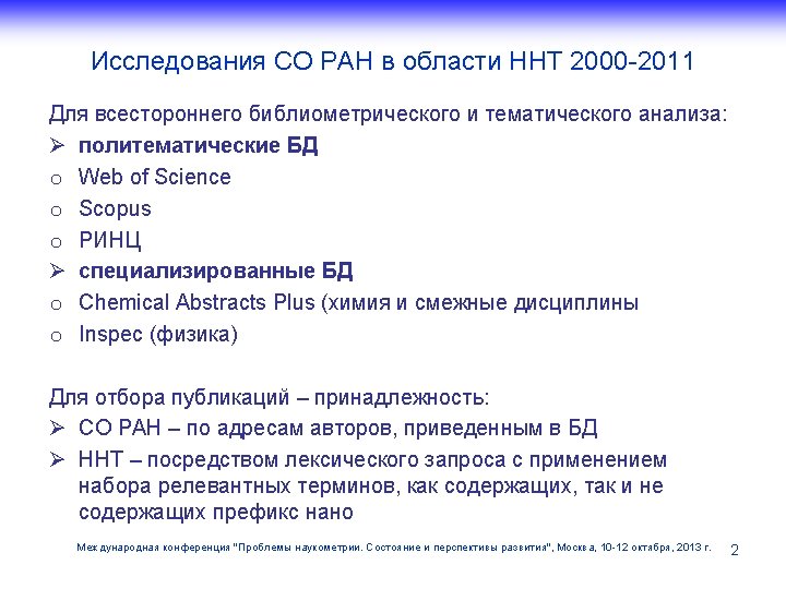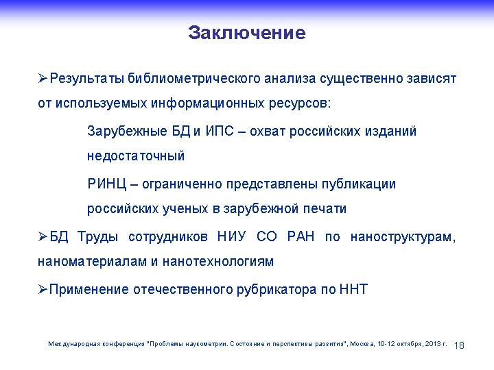 Распределение публикаций по контролируемым терминам тезаурусов БД CAPlus и БД Inspec Термин Nanoparticles Nanostructures Nanotubes Nanocomposites Nanocrystals Nanostructured materials Nanotechnology Nanofabrication Carbon nanotubes Nanoelectronics Nanowires Nanoporous materials Nanophotonics Nanosensors Количество публикаций CAPlus Inspec 582 237 198 185 150 64 7 2 – – 16 9 – 1 953 309 858 155 122 911 512 441 152 111 46 46 45 44 Международная конференция "Проблемы наукометрии. Состояние и перспективы развития", Москва, 10 -12 октября, 2013 г. 16