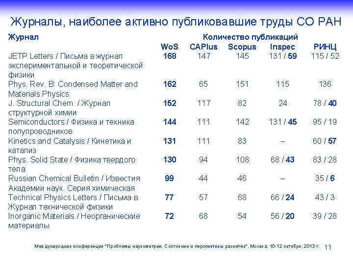 Распределение публикаций по рубрикам CAPlus Рубрика Electric phenomena Optical, electron, and mass spectroscopy and other related properties Количество публикаций 1021 668 Crystallography and liquid crystals 501 Surface chemistry and colloids Ceramics Nonferrous metals and alloys Catalysis, reaction kinetics, and inorganic reaction mechanisms Magnetic phenomena 490 458 455 312 286 Inorganic chemicals and reactions 226 General physical chemistry 208 Международная конференция "Проблемы наукометрии. Состояние и перспективы развития", Москва, 10 -12 октября, 2013 г. 14