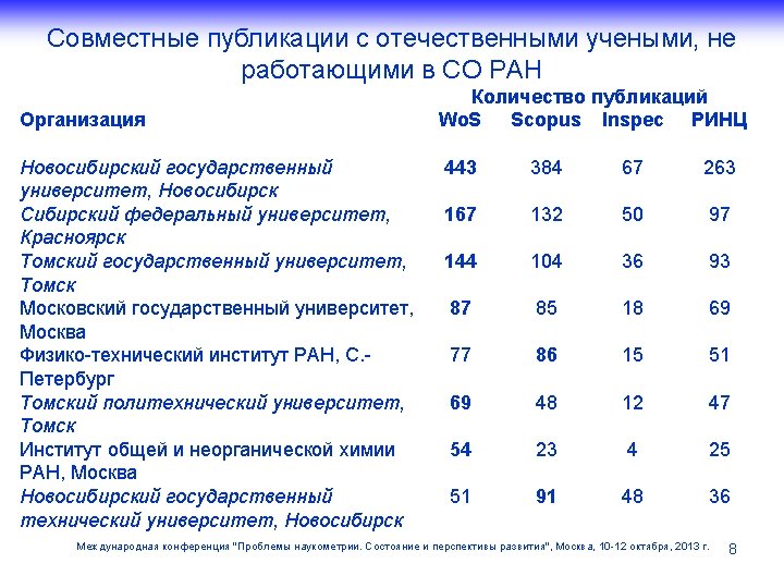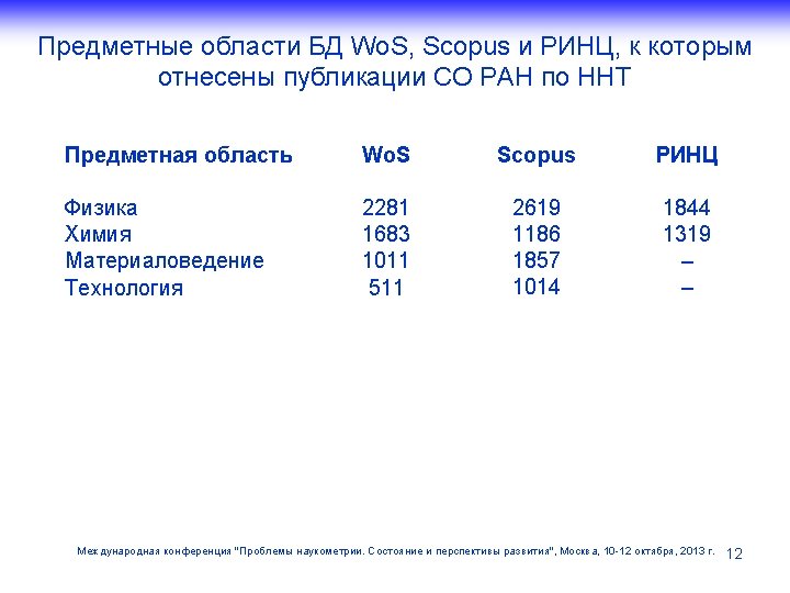 Предметные категории БД Wo. S, к которым отнесены публикации СО РАН по ННТ Предметная категория Chemistry, physical Physics, condensed matter Materials science, multidisciplinary Physics, applied Physics, multidisciplinary Chemistry, inorganic & nuclear Chemistry, multidisciplinary Nanoscience & Nanotechnology Количество публикаций 1007 959 813 780 475 398 345 334 Международная конференция "Проблемы наукометрии. Состояние и перспективы развития", Москва, 10 -12 октября, 2013 г. 13