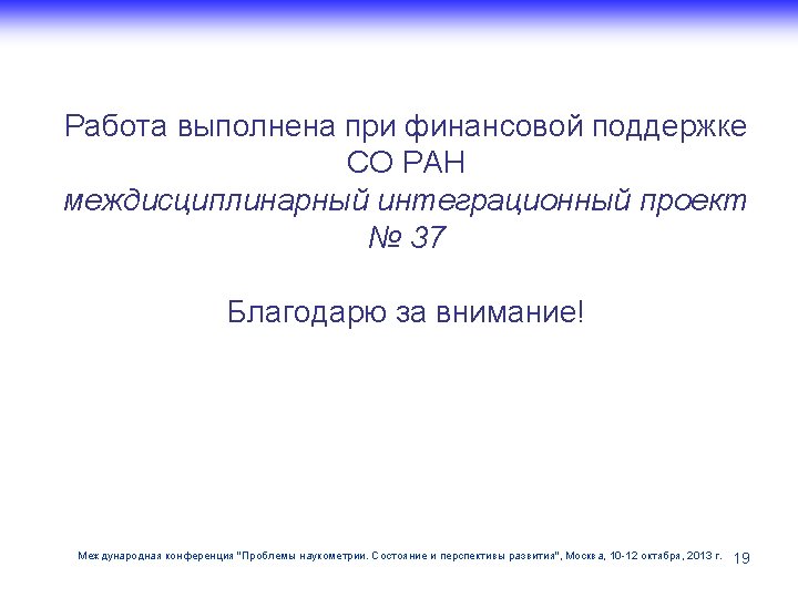 Наиболее цитируемые публикации по ННТ, аффилированные с СО РАН Публикация Chun H. Chem. – Eur. J. 2005. Prinz V. Y. Physica E. 2000. Bavykin D. V. J. Mater. Chem. 2004. Keller C. A. Phys. Rev. Lett. 2000. Tian B. Z. J. Am. Chem. Soc. 2004. Monthioux M. Carbon. 2006. Maillard F. Faraday Discuss. 2004. Suryanarayana C. Mat. Sci. Eng. A. 2001. Kleitz F. J. Phys. Chem. B. 2003. Ermakova M. A. J. Catal. 2001. Nair R. R. Small. 2010. Golod S. V. Semicond. Sci. Tech. 2001. Zhdanov V. P. Surf. Sci. Rep. 2000. Wo. S 433 335 271 224 173 170 165 148 142 139 114 107 14 Количество ссылок CAPlus Scopus 433 434 261 285 270 286 247 230 177 174 184 165 182 171 20 162 155 162 157 154 159 117 97 110 156 159 РИНЦ – 327 – 207 – 129 – – 122 138 – 121 157 Международная конференция "Проблемы наукометрии. Состояние и перспективы развития", Москва, 10 -12 октября, 2013 г. 17