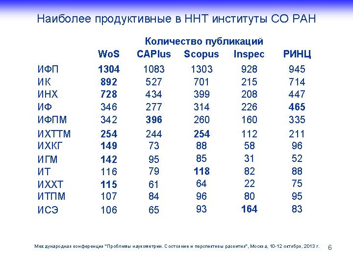 Распределение публикаций по рубрикам (классификационным кодам) БД Inspec Код Рубрика A 6146 Structure of solid clusters, nanoparticles, nanotubes and nanostructured materials Methods of nanofabrication and processing Amorphous and nanostructured magnetic materials Nanometre-scale semiconductor fabrication technology A 8116 A 7550 K B 2550 N B 7230 M A 0710 C A 7125 W A 8783 B 0587 Microsensors and nanosensors Micromechanical and nanomechanical devices and systems Electronic structure of solid clusters and nanoparticles Nanotechnology applications in biomedicine Fullerenes, carbon nanotubes, and related materials (engineering materials science) Количество публикаций 695 430 123 120 43 41 41 26 21 Международная конференция "Проблемы наукометрии. Состояние и перспективы развития", Москва, 10 -12 октября, 2013 г. 15