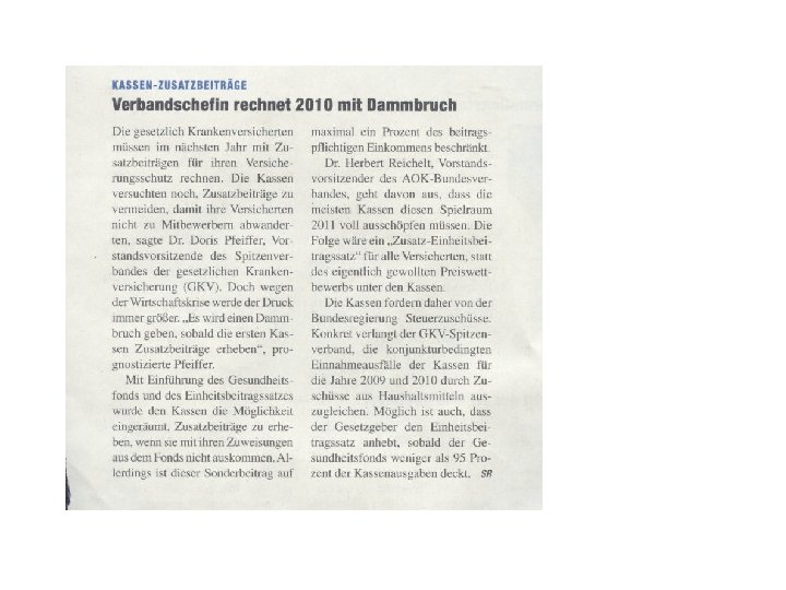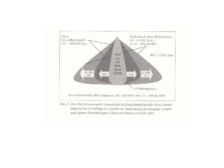 Thesen und Tatsachen • Zurzeit wird das Problem dieser Unterfinanzierung jedoch fast gänzlich auf den Schultern der sog. Leistungserbringer verdeckt abgeladen. • Ärzte, Schwestern, Pfleger, Physio- und Psychotherapeuten müssen den Patienten täglich im Angesicht und in jedem Einzelfall immer wieder mühsam neu erklären, warum diese oder jene medizinische Maßnahme nicht mehr verordnet oder durchgeführt werden kann, • warum der langjährig vertraute Betablocker der Firma X auf einmal durch den unbekannten (billigeren) der Firma Y ersetzt werden muss, • und warum Oma Schmitz sechs Monate auf einen Termin beim Neurologen warten muss, obwohl ihr Parkinson bereits seit Wochen aus dem Ruder läuft.