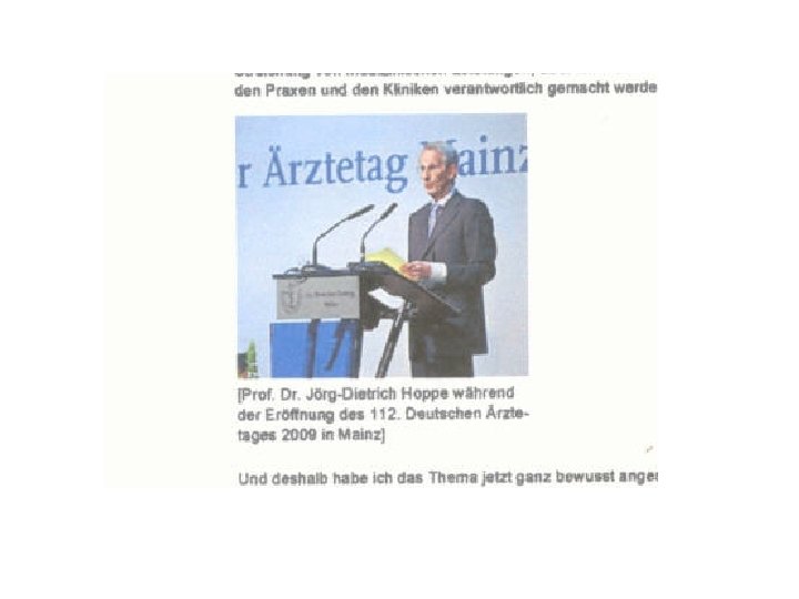 Thesen und Tatsachen • Vorwürfe Ärzteschaft and die Politik: Unbegrenztes Leistungsversprechen • Präsident der Bundesärztekammer (Hoppe): „ Wir Ärzte wollen keine Rationierung, aber wir wollen auch nicht für den staatlich verordneten Mangel in den Praxen und Klinken verantwortlich gemacht werden“ • Viel zu lange haben die Leistungserbringer die politische Schönrederei über die Unantastbarkeit der Vollversorgung für alle gedeckt und mit millionenfachen Überstunden, Honorar- und Imageeinbußen kompensiert.