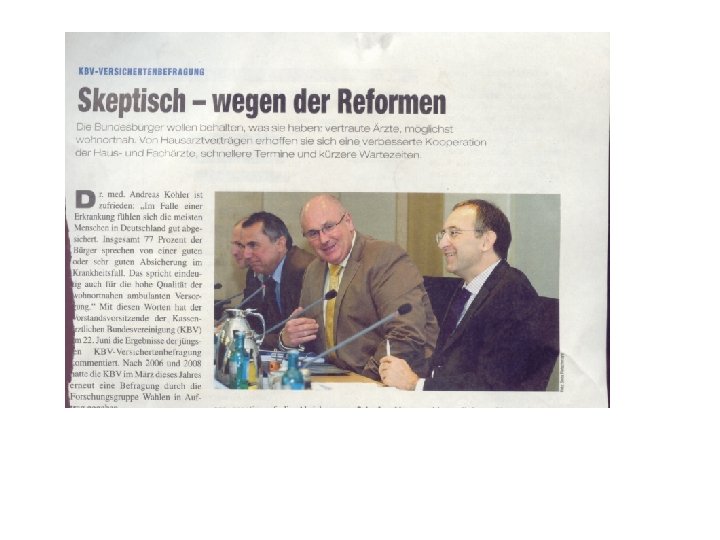Eigene Betrachtung der Probleme im Gesundheitswesen • Derzeit (? ) Konkurrenz Hausärzte, Fachärzte, Ermächtigungsärzte an Krankenhäusern • Bezahlung nach DRG (diagnosis related groups) an Krankenhäusern problematisch – Zunehmende Leistungsverdichtung – Zunehmend mangelnde Ausbildung • Medizin wird weiblich! • Hoher Anteil von Studenten, die aus Deutschland abwandern bzw. nichtpatientenzentriert arbeiten