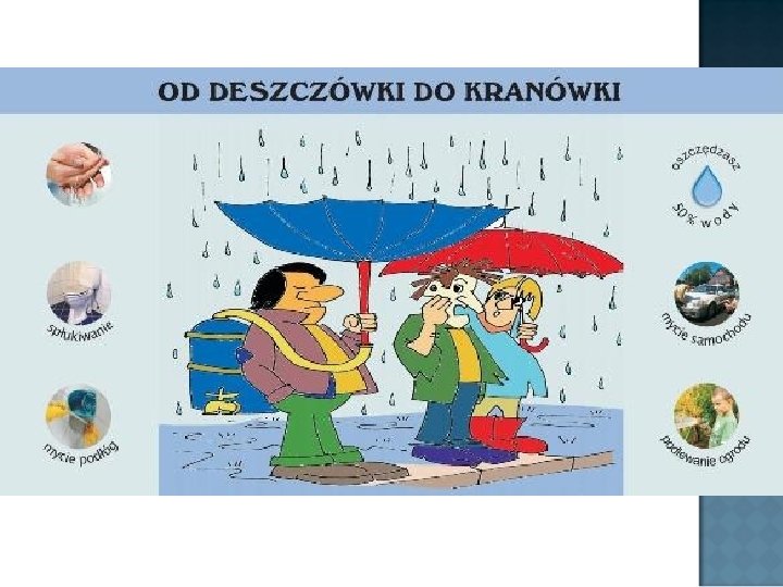 Najważniejszym, jedynym odnawialnym przez przyrodę, źródłem wody do picia jest woda deszczowa. Każdy z nas powinien ją chronić, cenić i szanować – dobrze zagospodarowana będzie służyć każdemu, natomiast niezagospodarowana może spowodować wielkie zagrożenia: powodzie, podtopienia, skażenie środowiska. Aby nie pojawił się dzień, w którym z kranu nie popłynie woda: Ratujmy w Polsce deszczówkę!
