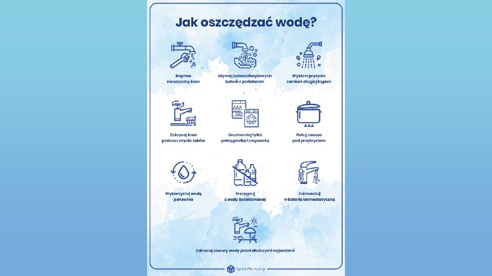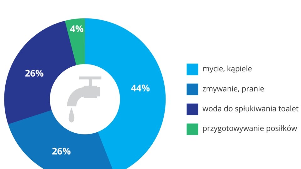 Pomimo tego, że woda jest wszechobecna wokół nas, może nam jej kiedyś zabraknąć. Powinniśmy oszczędzać ten cenny zasób. Każda osoba zużywa średnio aż 150 litrów wody dziennie. Jedynie 2 -3 litry zużywane jest do celów konsumpcyjnych. Nawet 30 litrów H 2 O tracimy przez spłukiwanie wody w toalecie. Pełna wanna wody to nawet 200 litrów!
