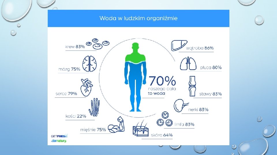 WODA STANOWI OKOŁO 60 -70% LUDZKIEGO CIAŁA. PROCENT TEN ZALEŻY OD WIEKU, PŁCI ORAZ WAGI DANEJ OSOBY. NOWORODKI SKŁADAJĄ SIĘ W PONAD 80% Z TEGO ZWIĄZKU CHEMICZNEGO.