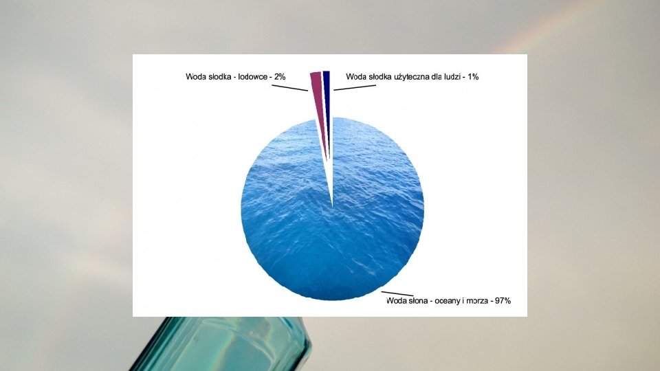 Około 71 procent powierzchni Ziemi jest pokryte wodą, a ponad 96% tej wody występuje w oceanach jako woda słona. To mniej więcej 1 386 000 000 000 litrów!! Woda słodka to zaledwie 4% wszystkich wód. Około 2% z nich ukryte są w lodowcach i śniegach. Jedynie 2% zasobów wody jest zdatne do picia. Wody podziemne stanowią około 30% wód słodkich, a rzeki, jeziora itp. Zaledwie 0, 4% zasobów.