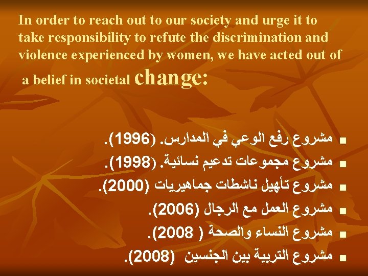 The association established its work through our responsibility to deal with the issue as a feminist issue and not only as a service and assistance (support, containment, change policies, struggle, demonstrations. . ) It started providing services which includes: Help Center for Victims of Sexual and Physical Violence. (1992). Shelter for battered women and their children. (1993). Transitional House for Women. Girls' Shelter (1993 -2003)lost it to a company du to the– policy of the ministry of welfare