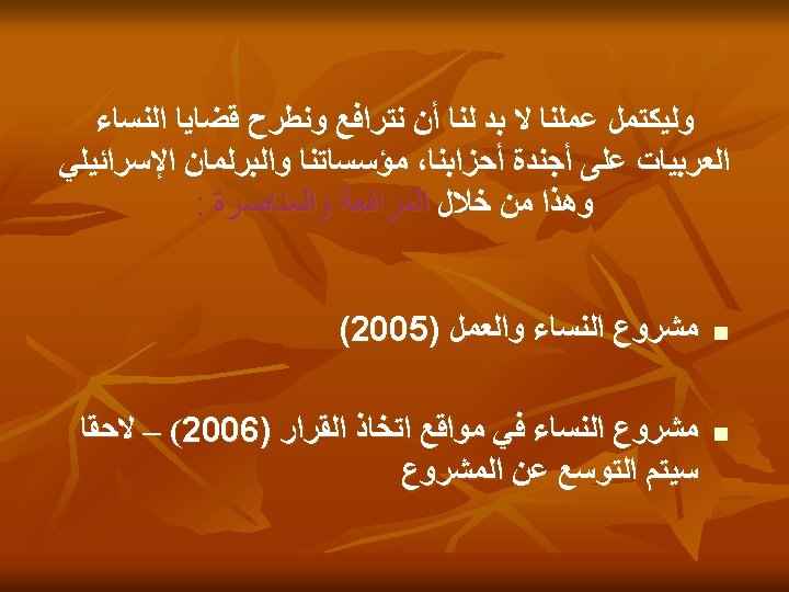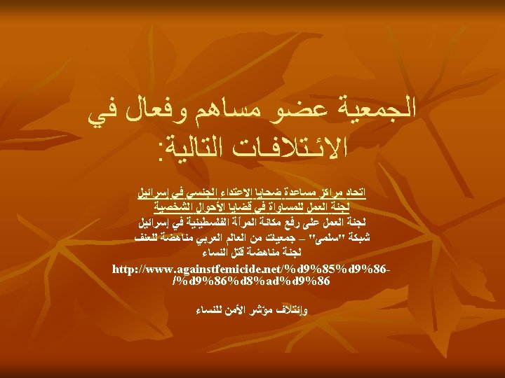 Our goals Raise the status of Palestinian Arab women n in the country, reduce violence against women, enhance the participation and representation of women in decision-making positions and community leadership, organize and activate society in all its components, especially women, to work towards achieving full equality for Palestinian Arab women in Israel, in all areas of life