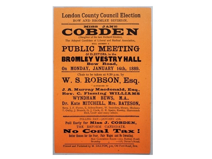 Councillors • London County Council established as a result of the 1888 County Councils Act. • The 118 councillors were elected by household suffrage with female ratepayers eligible to vote • New County Councils Act stated that ‘every person shall be qualified to be a councillor who is qualified to elect to the office of a councillor’. • The Society for Promoting the Return of Women as County Councillors put forward Jane Cobden as a Progressive candidate in Bow and Bromley, with Lady Sandhurst standing for Brixton. Both women were elected and the Council then co-opted Emma Cons a prominent Liberal philanthropist as an alderman.