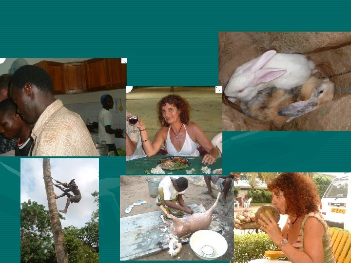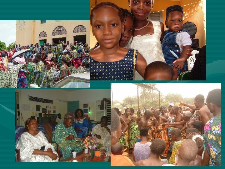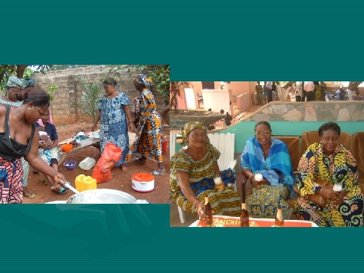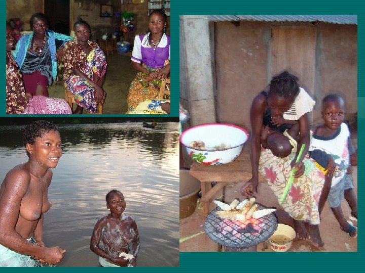 Meals • • Everyone is invited to join if dinner time Women prepare all day with the help of neighbors Fresh fish, chicken or meat Staple food: manioc, corn, rice, potatoes, platens, served with sauce made of hot peppers, pimento, special red dates and tomatoes No desert most times Beer or wine (vine, palm, corn) Eat with hands or silverware Dishes washed by hand. Sometimes share dishes (guests eat first).