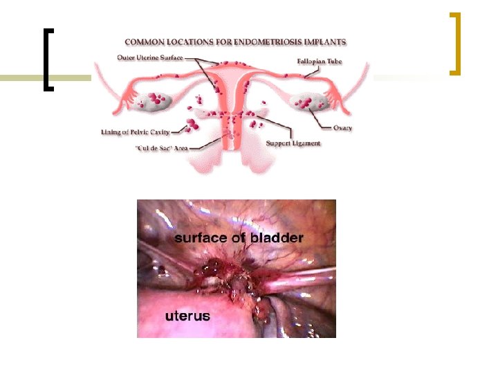 Endometriosis n n Pelvic pain - related to menstrual cycle Dyspareunia - painful intercourse Abnormal uterine bleeding Bimanual examination ¡ ¡ ¡ Fixed, tender, retroverted uterus Palpable nodules in cul-de-sac Diagnosis confirmed by laparoscopy