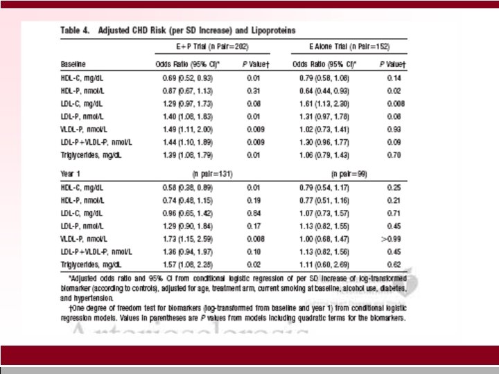 VLDL/Triglyceride Measures Triglycerides Q 1 Q 2 Q 3 Q 4 Q 5 Ptrend 1. 00 1. 45 1. 59 2. 65 4. 12 <0. 001 *Adjusted for age, smk, ASA/VE assignment, menopause, HRT, BP, BMI