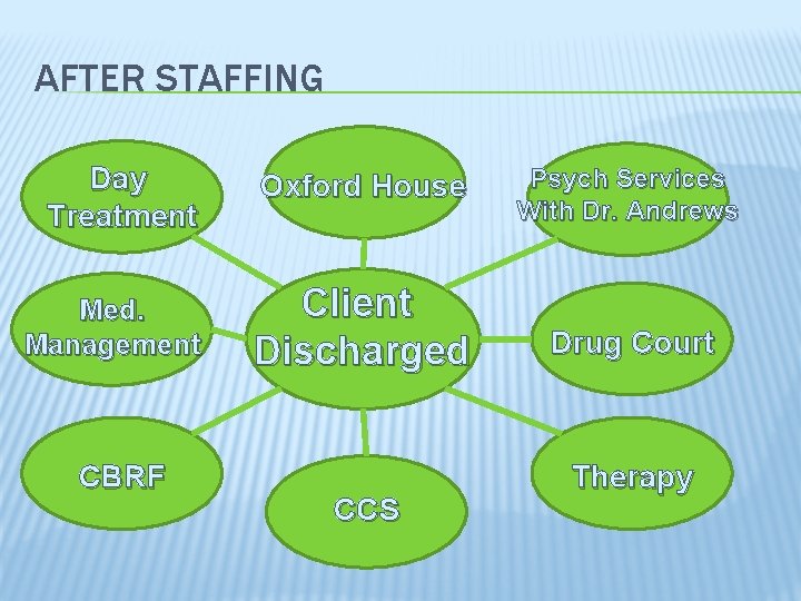 AFTER STAFFING Day Treatment Oxford House Med. Management Client Discharged CBRF CCS Psych Services With Dr. Andrews Drug Court Therapy