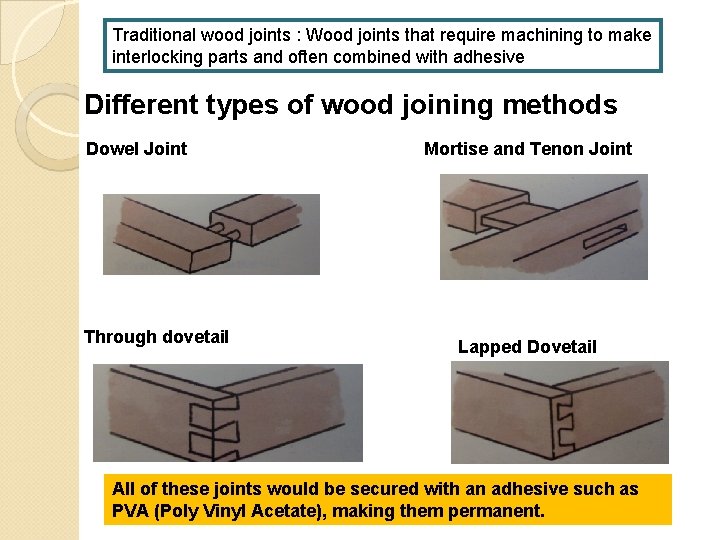 Traditional wood joints : Wood joints that require machining to make interlocking parts and often combined with adhesive Different types of wood joining methods Dowel Joint Through dovetail Mortise and Tenon Joint Lapped Dovetail All of these joints would be secured with an adhesive such as PVA (Poly Vinyl Acetate), making them permanent.