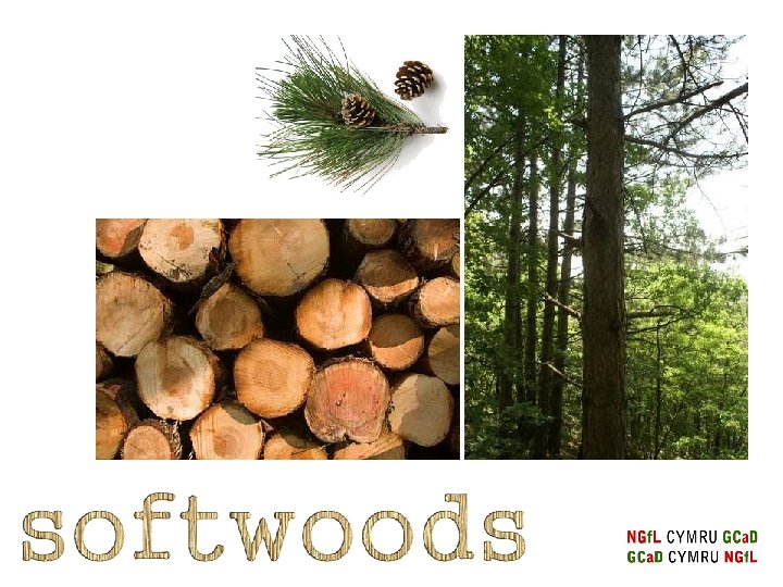 Softwood This type of timber is produced from trees that do not lose their leaves (coniferous). Softwood trees grow much quicker than the hardwood ones, they are therefore cheaper to buy and far more available. Softwood is used for construction of houses and furniture, and outdoor uses such as fencing. Leaves are easily identified as being thin and narrow. The term softwood does not mean that the timber is soft , as pitch pine is one of the most difficult timbers to work with, yet is a member of this group Some photograph courtesy of photolibrary wales