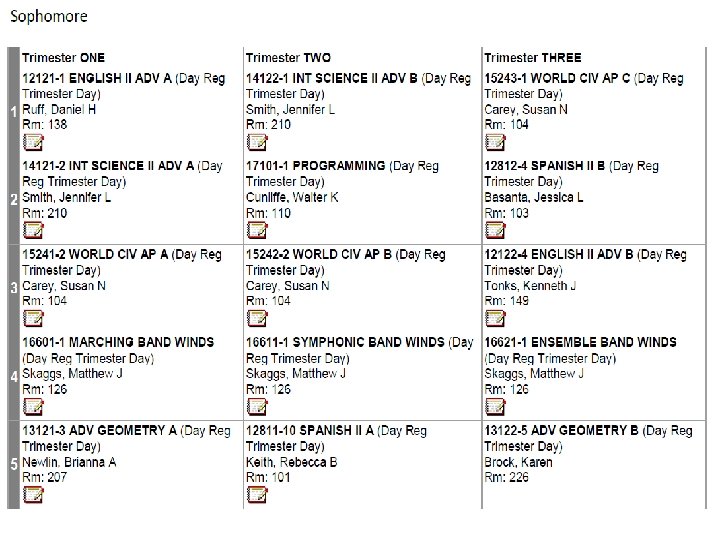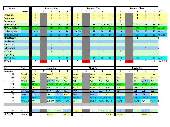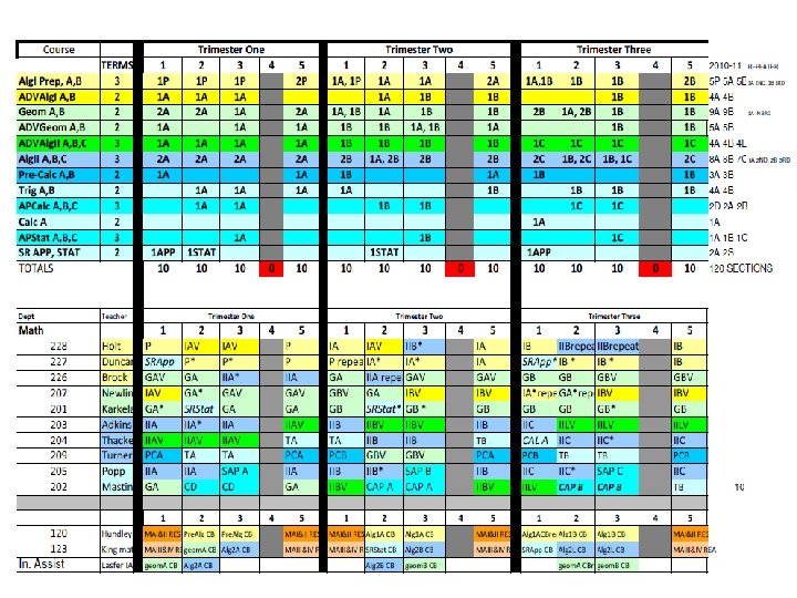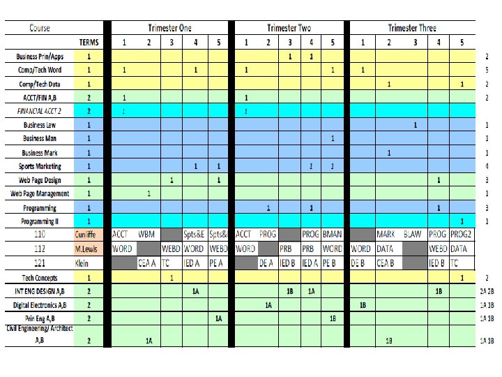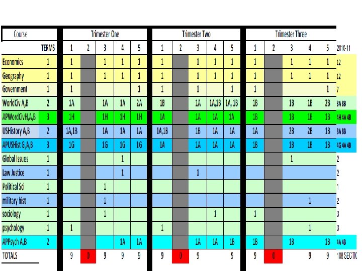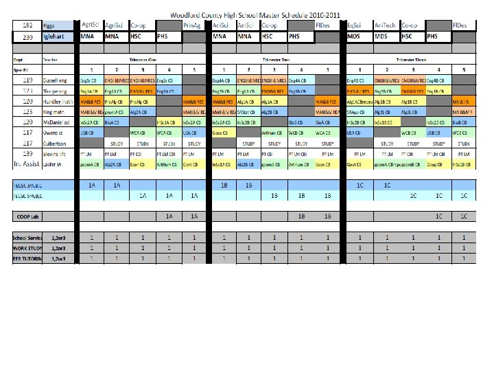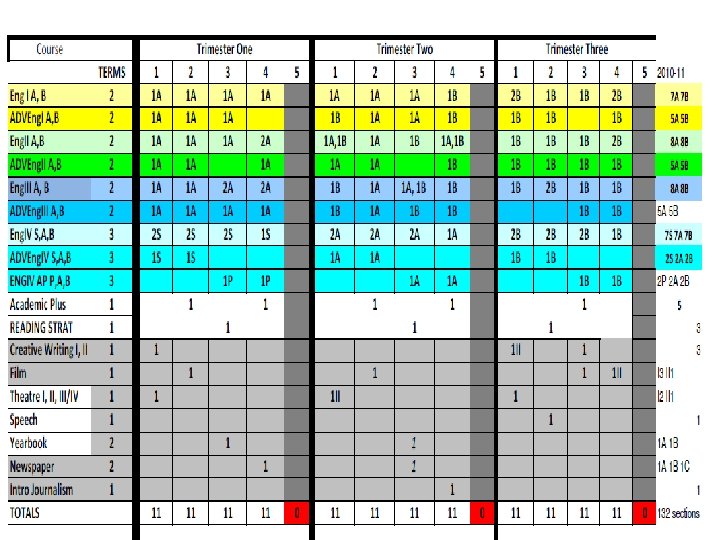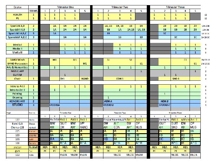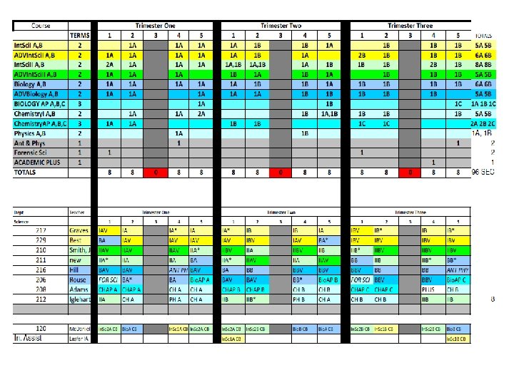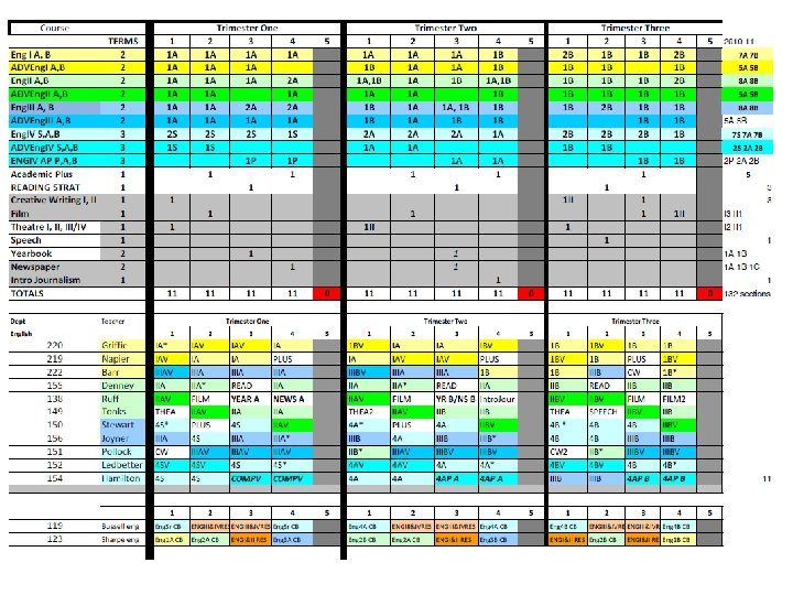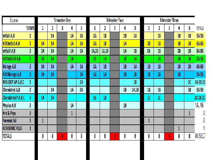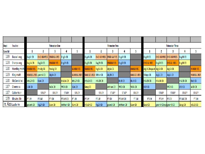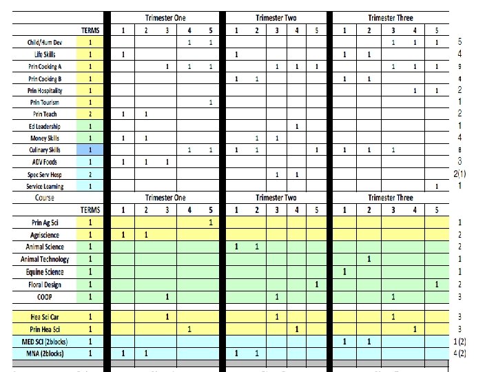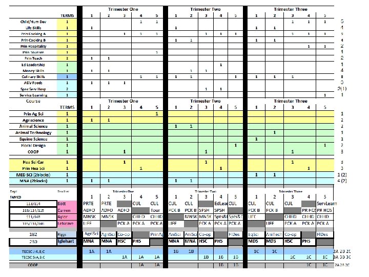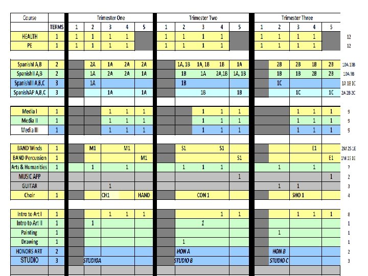 English 09 -10 trimester 08 -09 4 x 4 block MATH 09 -10 trimester 08 -09 4 x 4 block ELECTIVES 09 -10 trimester 08 -09 4 x 4 block Eng I 9 A 9 B 8 Alg. I 8 P 8 A 7 B 7 Business Prin/Apps 3 3 ADVEng. I 4 A 4 B 4 ADVAlg. I 3 A 3 B 2 Comp/Tech Word-Data 6 5 Eng. II 9 A 9 B 8 f. ADVGeom 2 A 2 B 2 2 A, 2 B 1 ADVEng. II 4 A 4 B 3 Geom 9 A 7 B 8 ACCT/FIN Business Law/Man/Mark 4 1 Eng. III 9 A 9 B 8 ADVGeom 3 A 3 B 2 Web Page Design 4 3 ADVEng. III 2 A 2 B 3 ADVAlg. II 5 A 5 B 5 C 4 Web Page Management 1 1 Eng. IV 6 S 6 A 6 B 6 (12) Alg. II 9 A 9 B 8 C 7 Programming 3 2 ADVEng. IV 3 S 3 A 3 B 2 (12) Pre-Calc 3 A 3 B 3 Programming II 1 1 ENGIV AP 2 P 2 A 2 B 2 (12) Trig 4 A 4 B 1 Total Bus 596 kids 546 kids Academic Plus 6 0 Prep. College 0 3 Tech Concepts 3 3 READING STRAT Creative Writing Film 3 2 3 0 1 1 AP Calc AP Stat 2 A 2 B 2 C 1 1 A 1 B 1 C 2 1 1 Tech. Des Apps INT ENG DES Prin Eng A, B 2 2 A 2 B 1 A 1 B 0 2 1 Theatre 4 2 MATH STRAT 1 0 Spe Prob Woods 1 1 Speech 1 0 Total Tech 206 kids 193 kids Yearbook 2 1 Social Studies 09 -10 trimester Newspaper 2 1 Economics Athletic Dir 2 0 Science 09 -10 trimester 08 -09 4 x 4 block Int. Sci. I ADVInt. Sci. I 7 A 7 B 5 A 5 B 8 4 Prin Ag Sci 1 1 12 08 -09 4 x 4 block 12 Agriscience 1 2 Geography 12 12 Animal Science 1 0 World. Civ 9 A 9 B 9 Animal Tech 1 0 AP Word. Civ 4 H 4 A 4 B Equine Science 1 0 Government USHistory 8 8 A 8 B 0 8 Farm Manage Floral Design 1 1 0 0 3 Int. Sci. II 8 A 8 B 8 AP USHist 3 G 3 A 3 B 4 Greenhouse Tech 2 A 2 B 1 ADVInt. Sci. II Biology ADVBiology Chemistry. I Chemistry. AP 6 A 6 B 4 A 4 B 3 A 3 B 3 C 4 7 4 6 1 Global Issues Law Justice Political Sci military hist sociology 2 2 1 2 3 1 1 1 2 2 Plan/Land Sci Ag Machinery Total Agr. Hea Sci Car Prin Hea Sci 1 0 223 kids 2 2 0 2 215 kids 3 2 1 Physics AP 1 A 1 B 1 C 1 psychology 3 1 MED SCI (2 blocks) 4 (2) Ant & Phys 2 2 AP Psych 3 A 3 B 2 MNA (2 blocks) 4 (2) 0 Forensic Sci 2 1 AP Europ. Hist 1 A 1 B 0 Total Med Sci 143 kids 131 kids Child/Hum Dev 5 2 ELECTIVES 09 -10 trimester 08 -09 4 x 4 block Life Skills 4 2 Intro to Art I 6 169 kids 3 72 kids HEALTH 12 12 Prin Cooking 9 0 Intro to Art II 1 0 PE 12 12 Prin Hospitality 3 3 Paint / Draw HONART/studio Arts & Hum 3 3 9 1 1 7 Spanish. III 14 A 14 B 1 A 1 B 4 A 4 B 4 C 8 8 2 Prin Teach Child Dev II 2 2 1 0 MUSIC APP/ Guitar 6 0 Spanish. AP 2 A 2 B 2 C 2 Money Skills 4 0 Choir 3 2 Media 6 3 Culinary Skills 8 4 2 75 -80 kids ADV Foods 2 0 2 15 kids Spec Serv Hosp 2 (1) 0 Total Fam. CO 909 kids 485 kids TECSC Jr. A, B, C 2 A 2 B 2 C 2 BAND Winds 1 M 1 S 1 E 70 -78 kids TECSC Sr. A, B, C 3 A 3 B 3 C 2 BAND Percussion 1 M 1 S 1 E 10 -13 kids COOP 2 A 2 B 2 C 2