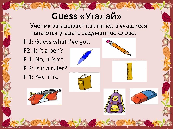 «Шпионы» • Teacher: I spy with my little eye something beginning with b. • Student: bag. Fokina. Lida. 75@mail. ru
