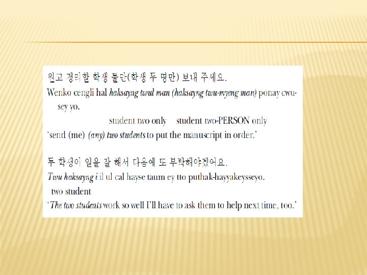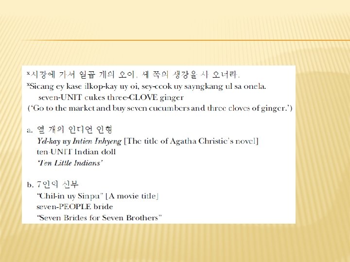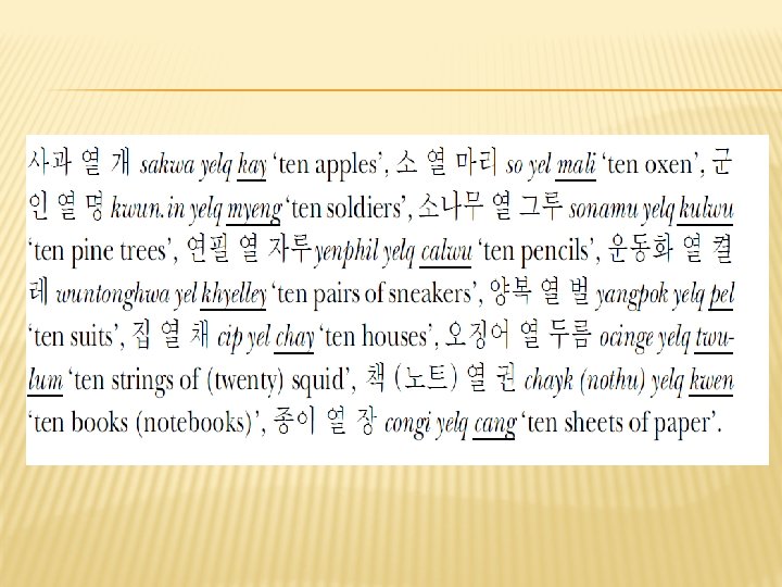 NUMBER � the grammatical category of “number” does not exist in Korean. � Sakwa lul han kay mekessta � 사과를 � Sakwa lul tases kay mekessta � 사과를 � Musun � 무슨 한 개 먹었다. 다섯 개 먹었다. chayk ul kuleh. key manh. i sassni? 책(들)을 그렇게 많이 샀니?