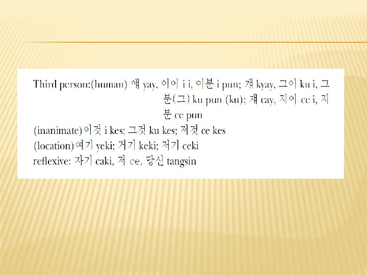 PRONOUNS � They have the syntactic characteristics of nouns; their grammatical functions are specified by postposed particles, and they are modified by prenouns. � First, the most representative pronouns found in Korean are given in the following list.