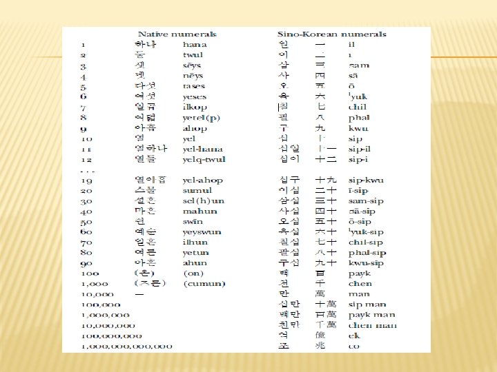 NUMERALS � There are two parallel sets of Korean numerals: one of native origin, and one of Chinese origin.