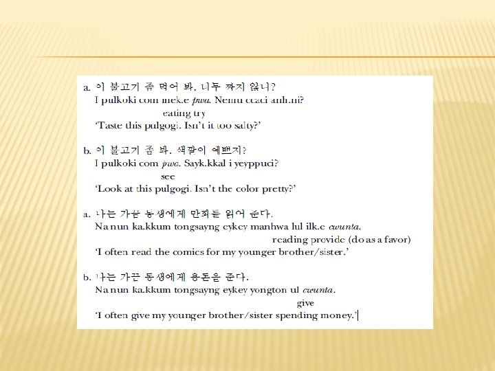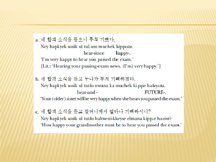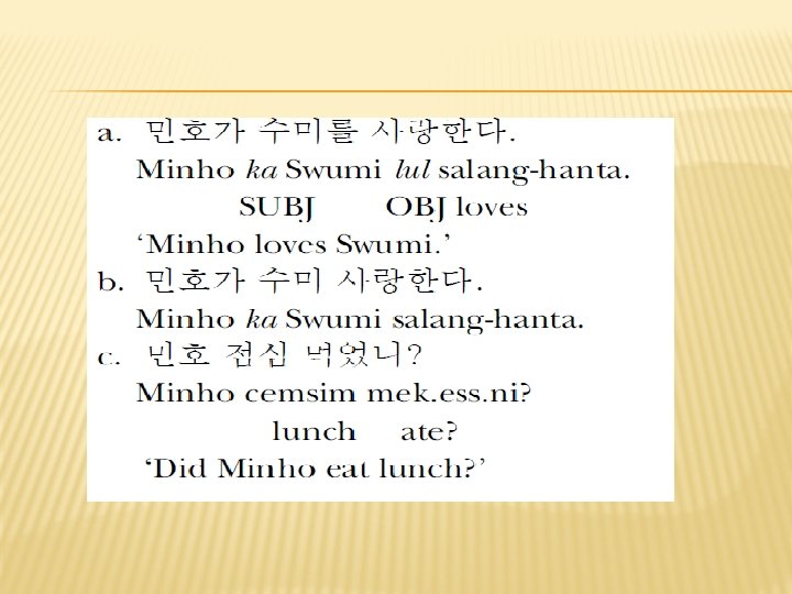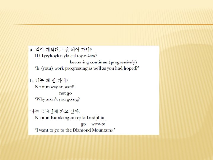 � 깨끗-하-니 � � INFLECTED WORD STEM 깨끗 하 니 � ROOT STEM � ROOT AND STEM, CALLED BASE INTEGRATEDLY �
