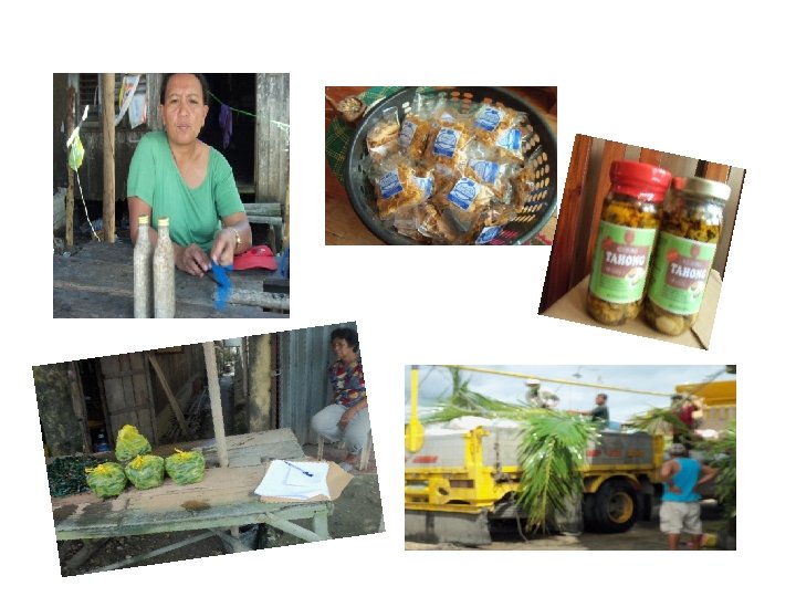 VC Function Economic Activity Woman Paid? Buying and peddling/ selling mussel products Brokering Recording sales Looks for transportation Trading Takes charge of deliveries & orders Owns mussel outlets Prepares the sacks Waits for tahong deliveries at the market NO (but profits from sales) Girl Peddling/selling of mussel products Paid? NO (but profits from sales)
