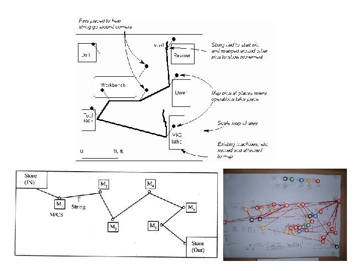 Record: Diagrams String Diagram • • • A scale layout drawing on which, length of a string is used to record the extent as well as the pattern of movement of a worker working within a limited area during a certain period of time. Purpose: to produce a record of a existing set of conditions so that the job of seeing what is actually taking place is made as simple as possible Procedures: 1. A layout of the work place of factory is drawn to scale on the soft board. 2. Pins are fixed into boards to mark the locations of work stations, pins are also driven at the turning points of the routes. 3. A measured length of the thread is taken to trace the movements (path). 4. The distance covered by the object is obtained by measuring the remaining part of the thread and subtracting it from original length.