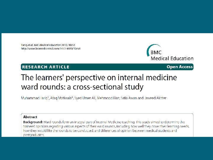 Ward Rounds and Cognitive Apprenticeship • The cognitive apprenticeship model is highly specific and it is believed that it can enhance learning in clinical practice and in the internal medicine ward rounds. • Currently there is sparse data available on application of cognitive apprenticeship model in clinical setting particularly with respect to learning in the ward rounds, which is the mainstay of clinical teaching especially in internal medicine.