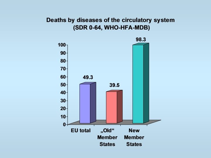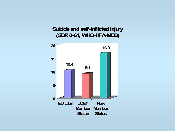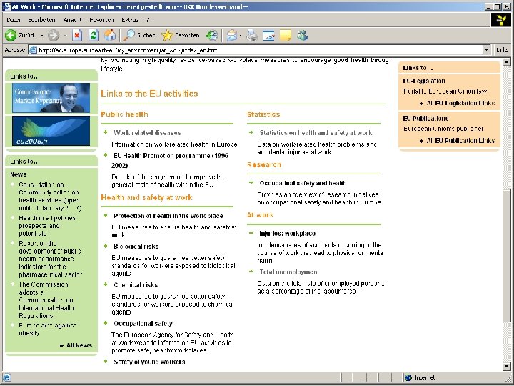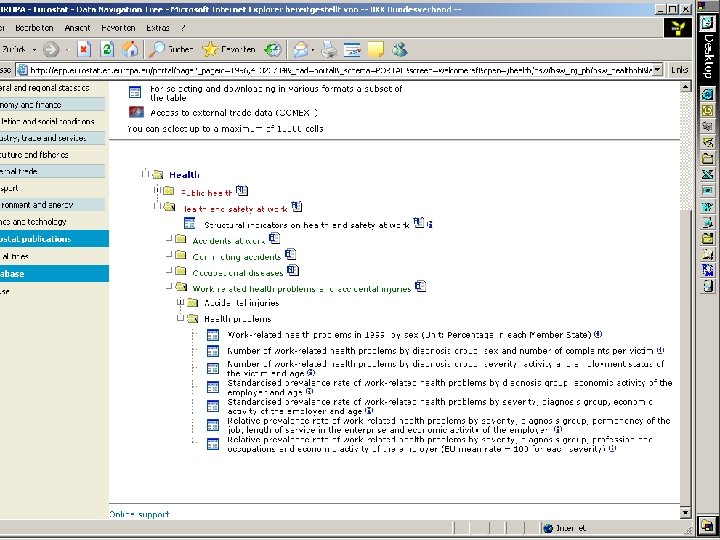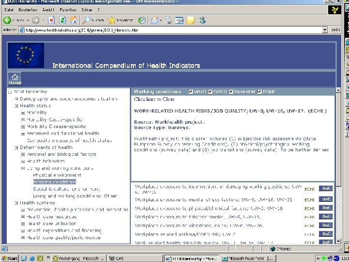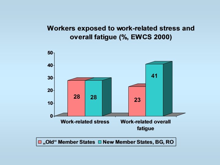 Data availability: Some remarks data for some countries are missing data are collected for only one year (LFS ad hoc module: only 1999) or quite infrequently (ESWC: approx. every 4 -5 years) there is a long time delay between collection and publication of data (EODS: 3 years) Improving data availability is a slow process if it is given no high political priority Is it possible to set up a European work-related public health report? What is the status of work-related health monitoring in the new member states?