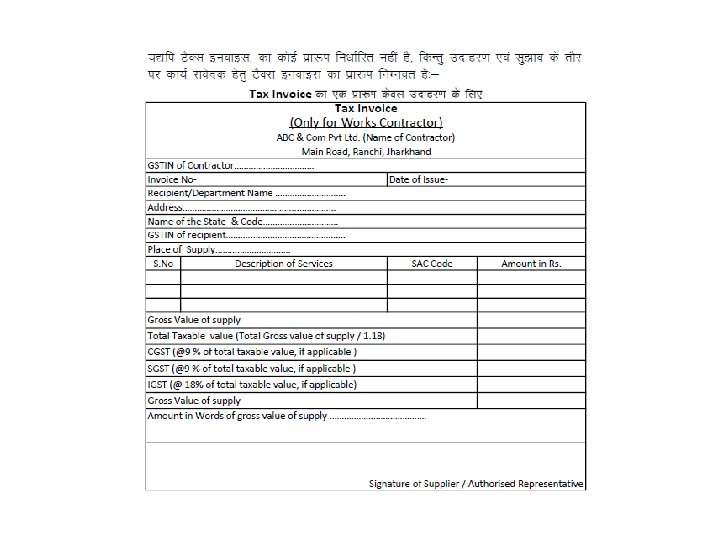 Tax Invoice for Works Contractor Issuance of Tax Invoice(section 31) Ø A registered works contractor supplying taxable services shall issue a tax invoice showing 16 particulars prescribed u/r 46. Ø The said tax invoice shall be issued before or after the provision of services but within a period of 30 days from the date of the supply of service(u/r 47)